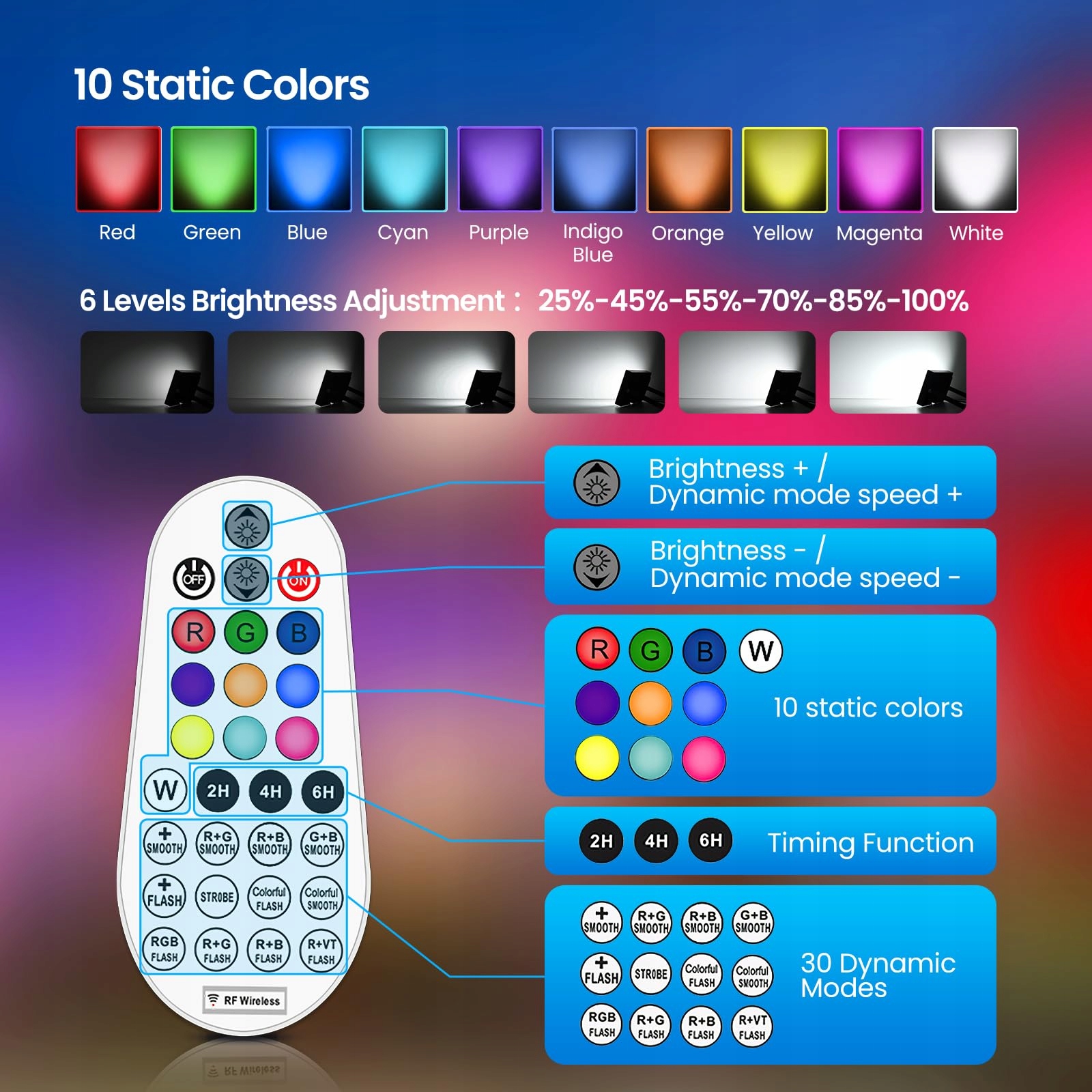 【Funkcja pamięci i czas wyłączenia 2H / 4H / 6H】Niezależnie od wyłączania za pomocą pilota, przerwy w zasilaniu czy wyłączenia, reflektor LED RGB zapamiętuje ostatnie ustawienie światła, bez potrzeby ponownego ustawiania. Za pomocą pilota można ustawić czas wyłączenia na 2H / 4H / 6H, dzięki czemu nie musisz wyłączać zasilania przed snem lub po imprezie, co jest wygodne i oszczędza energię.