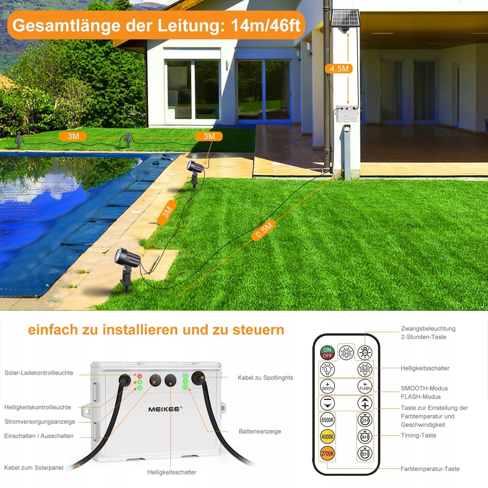 MEIKEE reflektory solarne do użytku zewnętrznego 4 sztuki z pilotem lampy solarne do użytku zewnętrznego 2700K 4000K 6000K 3 poziomy jasności IP66 wodoodporne lampy solarne do ogrodów, krzewów i drzew