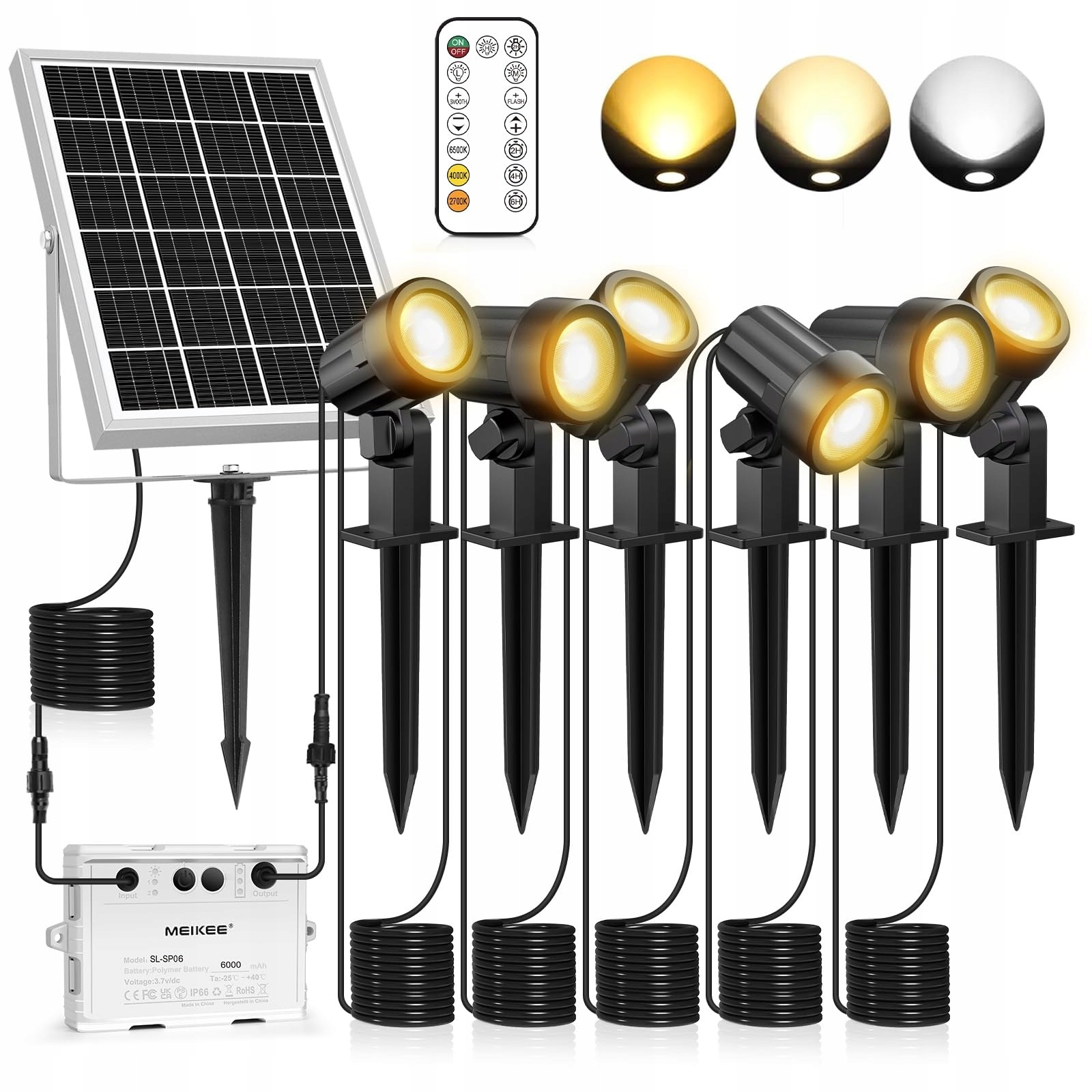 MEIKEE Solarne Reflektory 6 sztuk z pilotem Solarne Lampy Ogrodowe 2700K 4000K 6000K Lampy Solarne IP66 Wodoodporne 3 Poziomy Jasności Funkcja Timera Idealne do Ogrodu Tarasu Ścieżki Podjazdu Krzewów