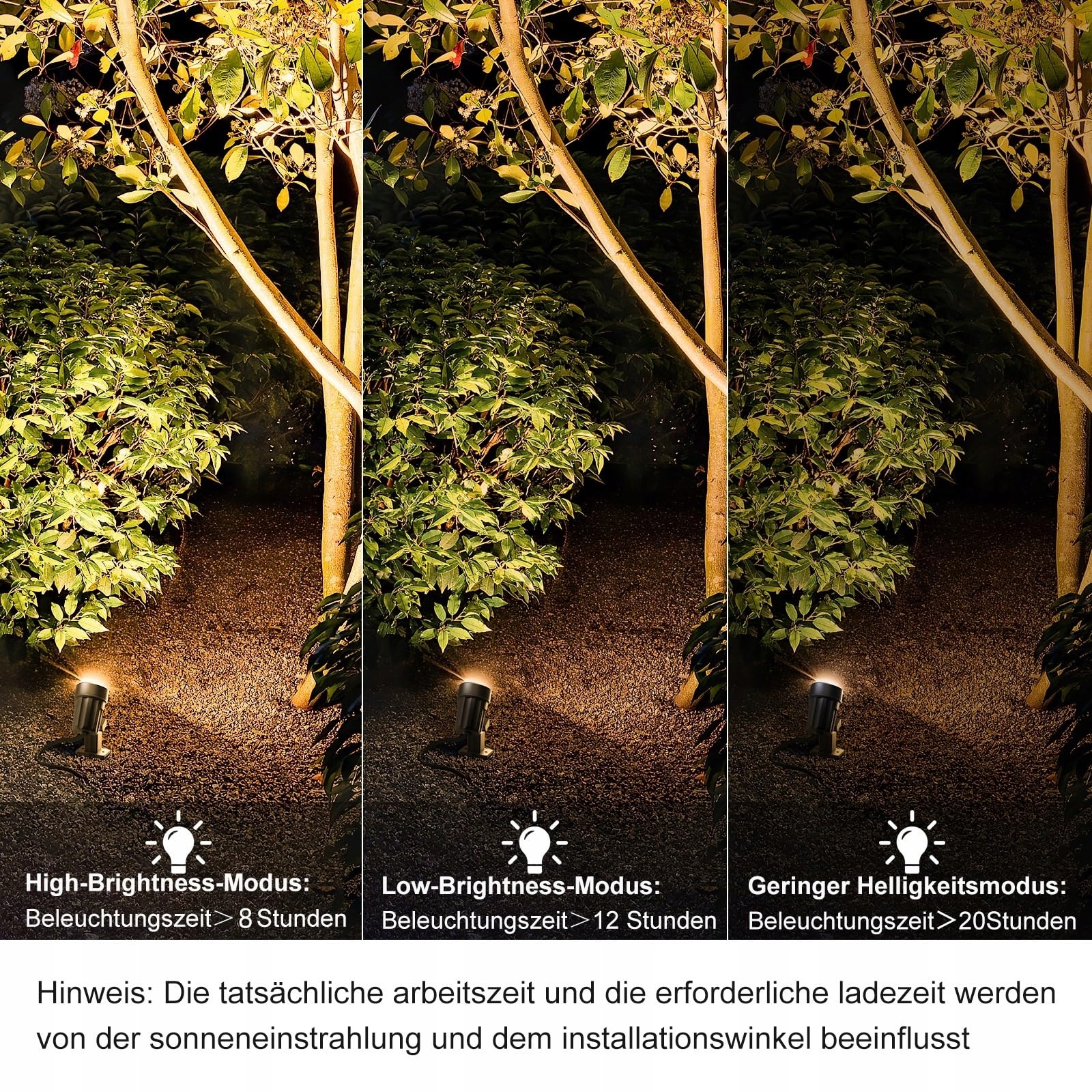 【3 poziomy jasności】Reflektor ogrodowy solarny ma kąt świecenia 120 stopni, projekcję światła zalewowego, duży obszar oświetlenia, równomierne rozproszenie światła i koloru, niskie zużycie energii oraz żywotność do 50 000 godzin. 3 poziomy jasności: wysoka jasność 600LM działa do 8 godzin, średnia jasność 450LM działa do 12 godzin, niska jasność 300LM działa do 20 godzin, dzięki czemu pozostaje jasny przez całą noc
