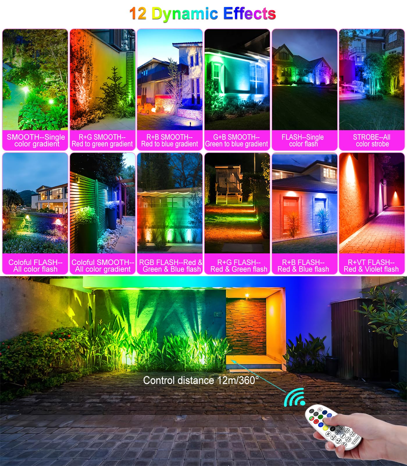 Zmiana kolorów: Solarna lampa RGB na zewnątrz ma 10 statycznych kolorów z wysoką / niską jasnością (50%-100%) oraz 12 dynamicznych trybów, w tym migotanie RGB, błysk lub łagodne migotanie kolorów, błysk lub łagodna zmiana 2 kolorów. Częstotliwość migotania można ustawić pilotem, aby spełnić Twoje potrzeby oświetleniowe w różnych scenach, takich jak dyskoteki i romantyczne kolacje