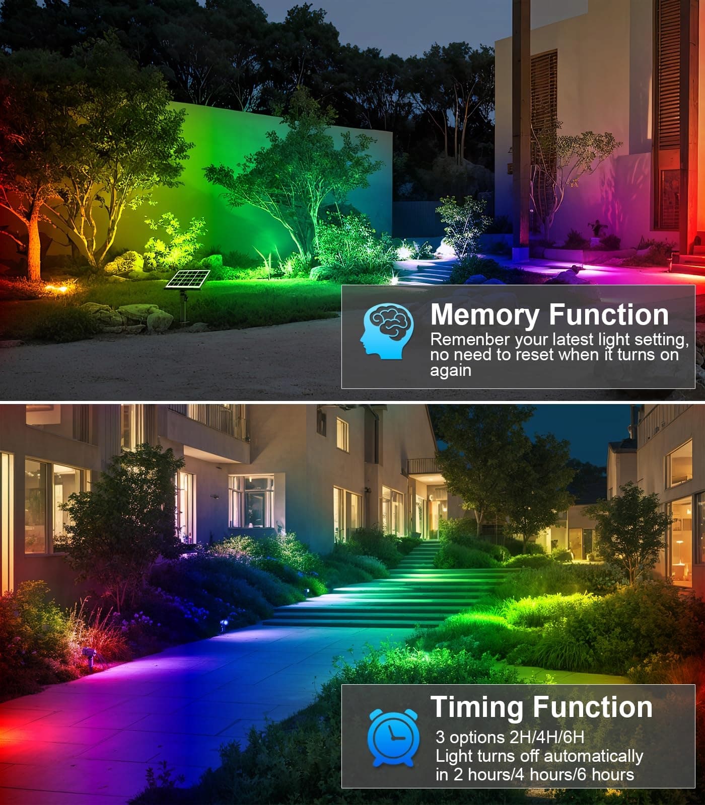 Funkcja pamięci i timer: W przypadku przerwy w zasilaniu lub wyłączenia reflektor RGB solar pamięta ostatnie ustawienia. Czas wyłączenia można ustawić na 2H/4H/6H, dzięki czemu nie trzeba go wyłączać przed snem lub po imprezie, co jest wygodne i oszczędza energię