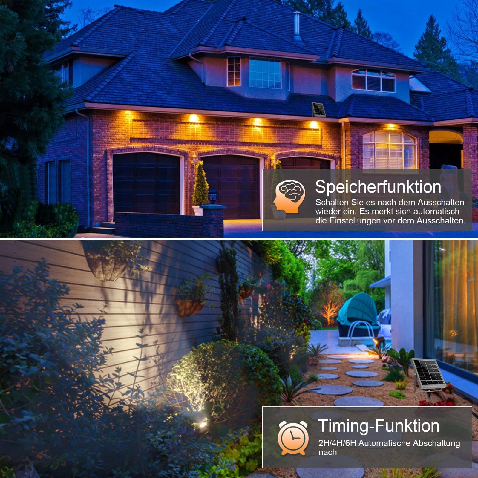 ★ Funkcja pamięci i czas wyłączenia 2 godziny/6 godzin/12 godzin: Niezależnie od tego, czy jest to zdalne wyłączenie, wyłączenie czy zamknięcie, solarne reflektory ogrodowe mogą zapamiętać ostatnie ustawienie światła, bez konieczności ponownego ustawiania. Możesz wyłączyć światło za pomocą pilota w trybie 2-godzinnym/4-godzinnym/6-godzinnym, dzięki czemu nie musisz wyłączać prądu przed snem lub po imprezie, co jest wygodne i oszczędza energię.