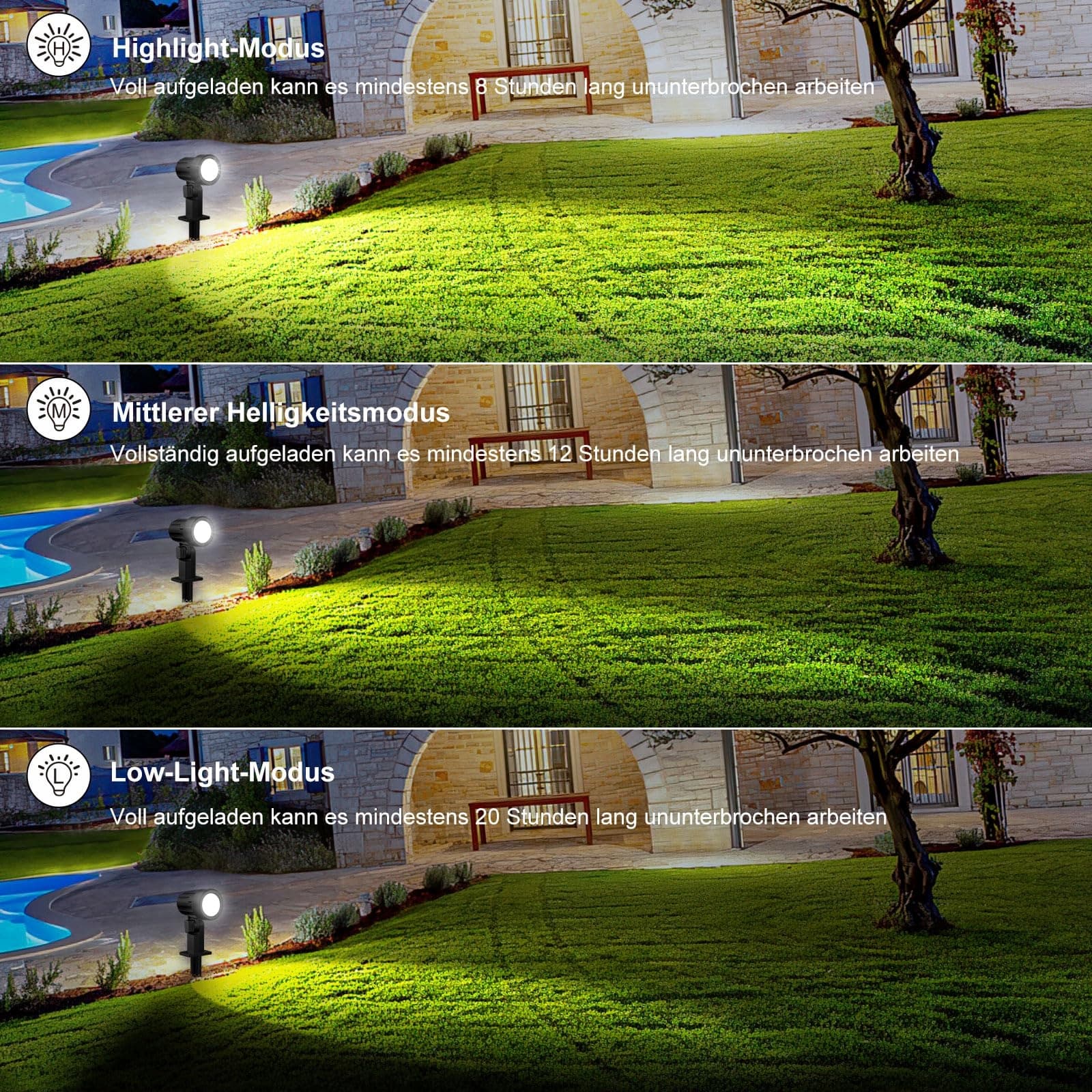 ★ 3 poziomy jasności i 3 temperatury barwowe: Tryb niskiej jasności: jasność 350LM, może pracować przez 20 godzin; Tryb średniej jasności: jasność 500LM, może pracować przez 12 godzin. Tryb wysokiej jasności: jasność 650LM, może pracować przez 8 godzin. Do wyboru są trzy temperatury barwowe: ciepłe białe, naturalne światło lub zimne białe. Jedna lampa solarna może spełnić Twoje różne potrzeby i stworzyć ciepłą atmosferę w ogrodzie.