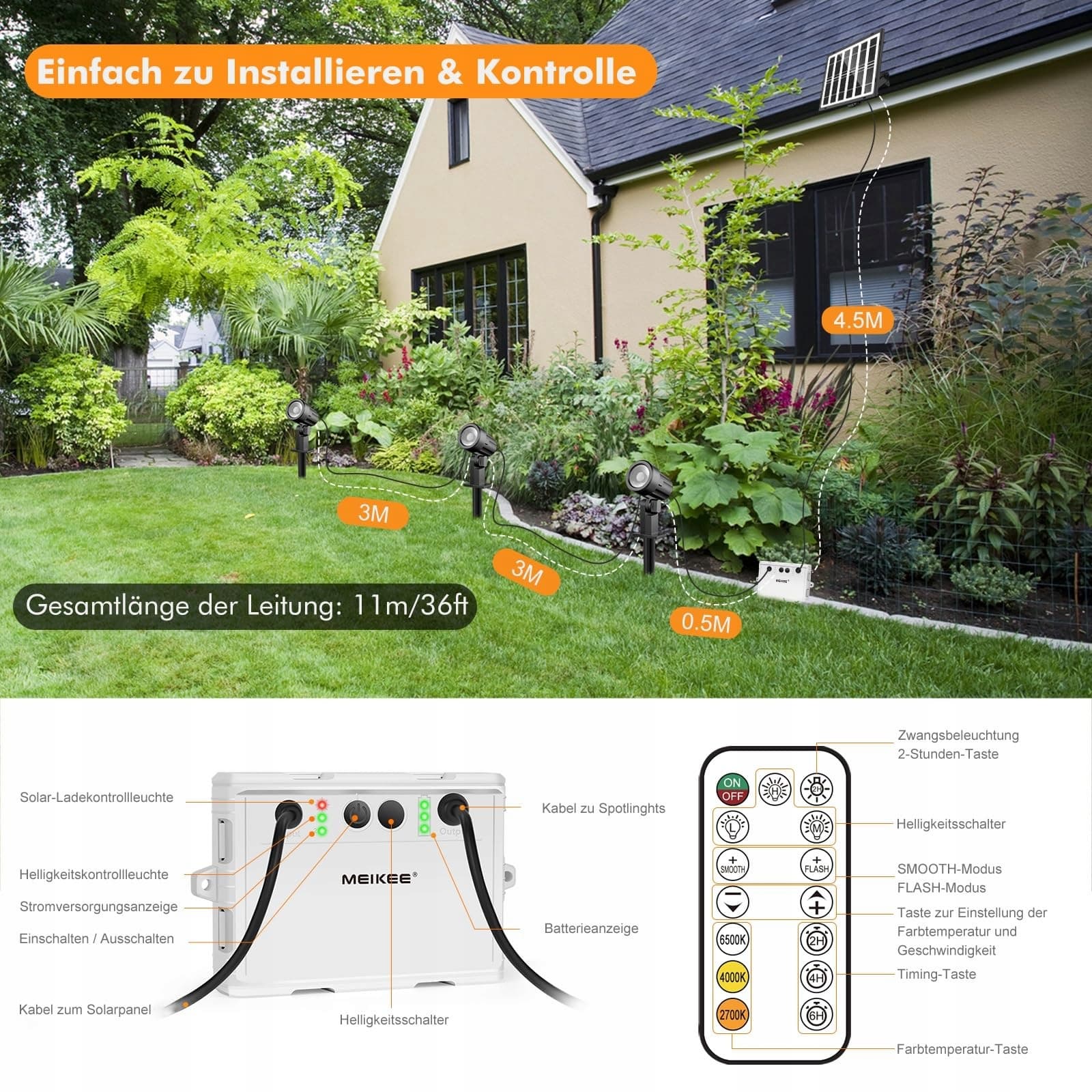 ★ Nowa aktualizacja, z pilotem: W porównaniu do innych tradycyjnych lamp solarnych, MEIKEE Solar Strahler jest wyposażony w pilota, który pozwala na sterowanie lampą w 360 stopniach. Zasięg pilota do 12 metrów. Możesz łatwo ustawić solarne oświetlenie ogrodowe w ogrodzie, leżąc na kanapie, co jest bardzo wygodne. Jednocześnie ma funkcję zmiany temperatury barwowej i migotania, co dodaje atmosfery podczas festiwalu.