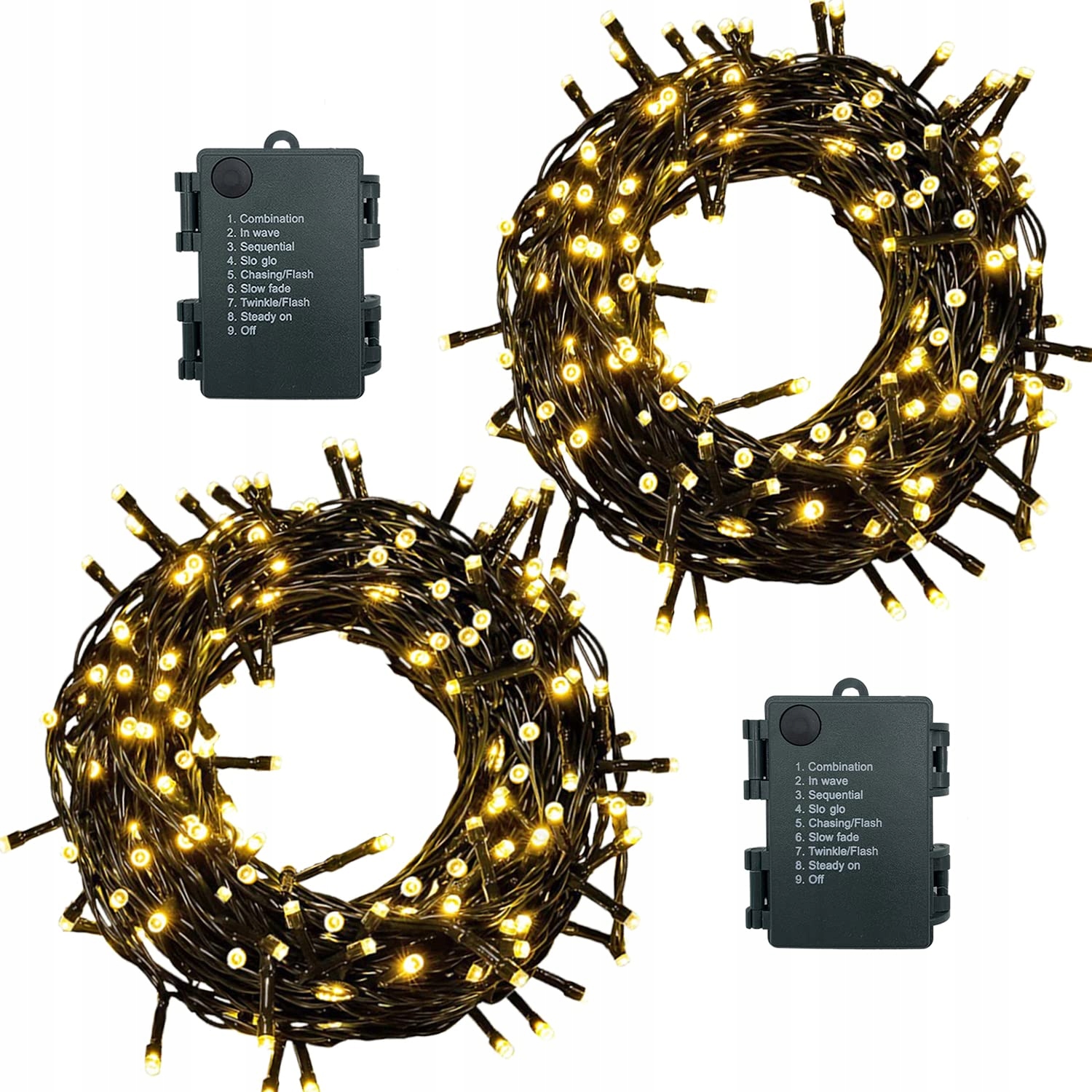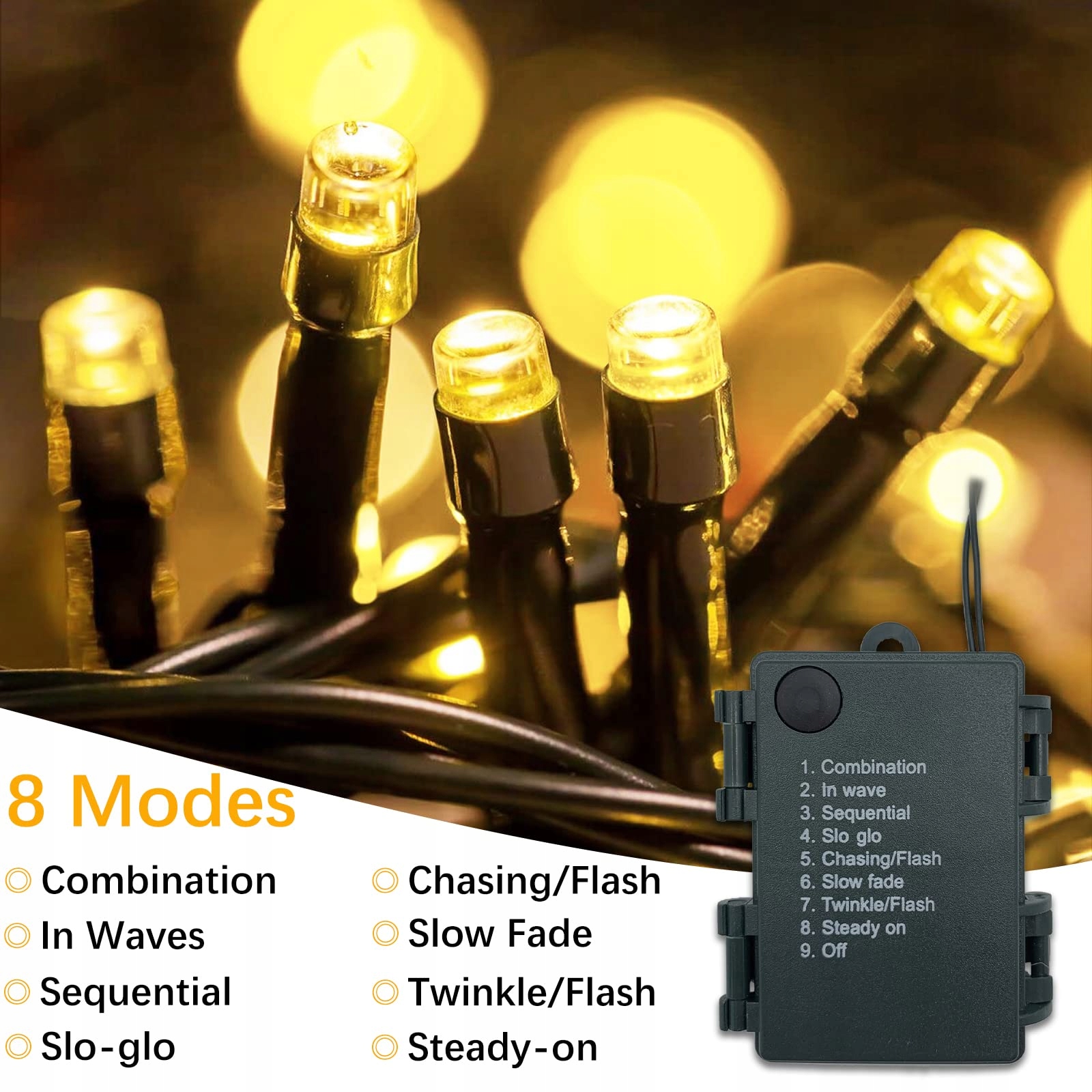 8 TRYBÓW ŚWIATŁA: Combination, In waves, Sequential, Slo-Glo, Chasing/Flash, Slow fade, Twinkle Flash, Steady on, OFF. Przyciski mogą być obsługiwane na pudełku na baterie, aby ustawić tryb światła.