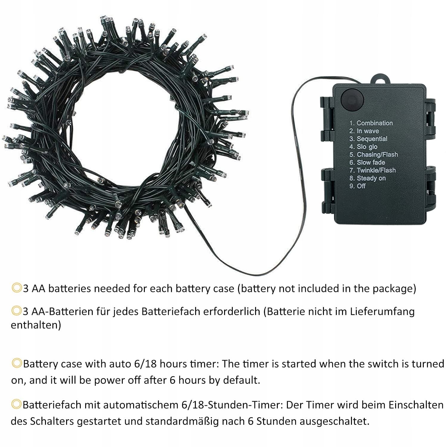 AUTOMATYCZNY TIMER: Pudełko na baterie jest wyposażone w automatyczny timer 6/18 godzin. Timer włącza się, gdy jest uruchomiony. Łańcuch świetlny wyłącza się automatycznie po 6 godzinach i włącza się automatycznie po 18 godzinach.