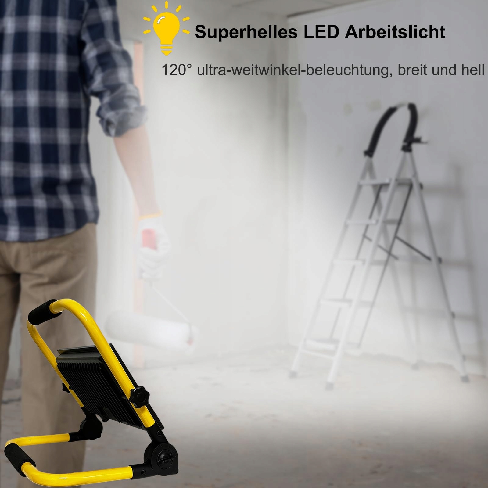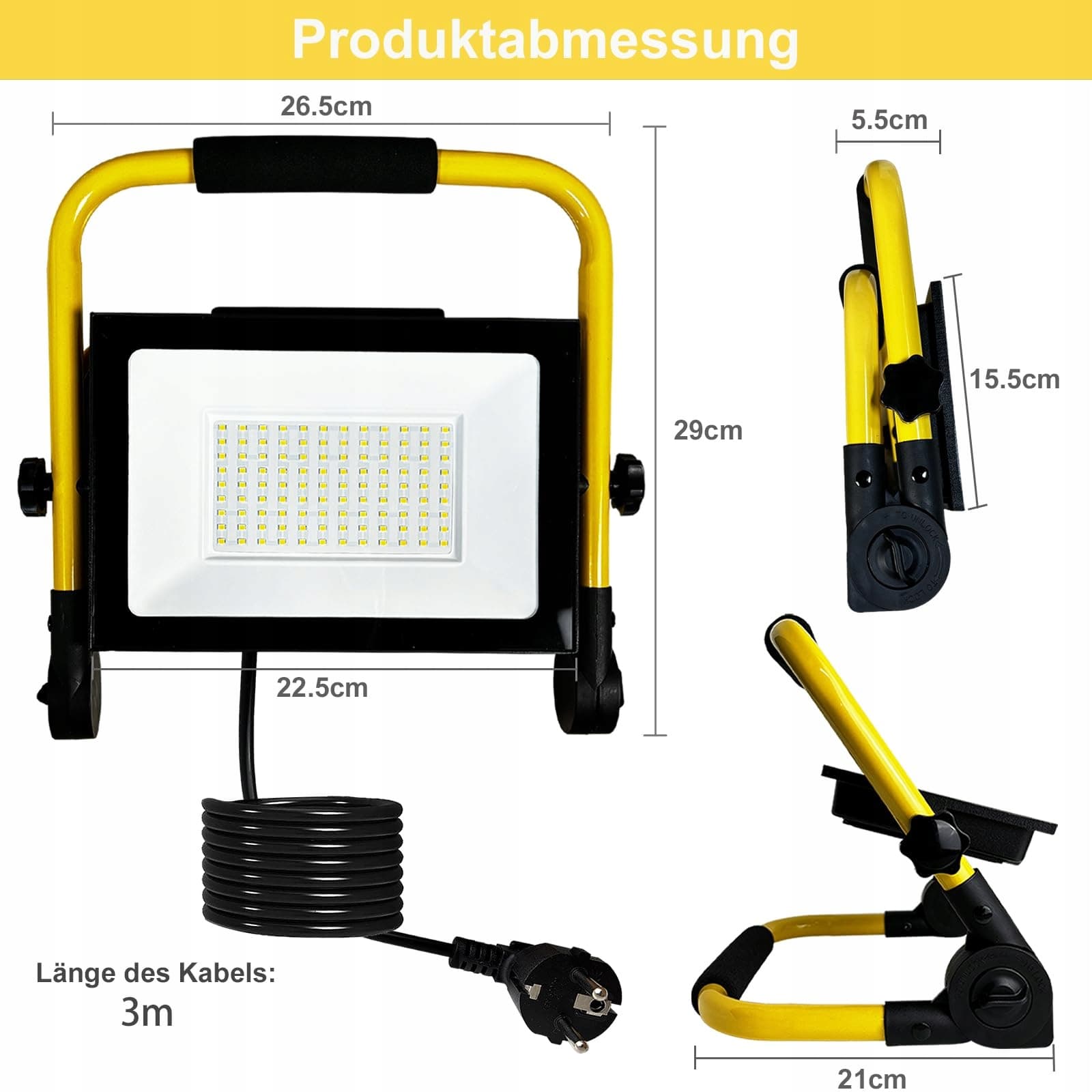 【Superjasny Reflektor Budowlany】Ta lampa budowlana jest wykonana z aluminium i wysokiej jakości hartowanego szkła, kabel zasilający ma 3m, z wtyczką EU i 108 wysokiej jakości diodami LED 2835, kolor jest zimnobiały, temperatura barwowa to 6500k, jasność dochodzi do 8500LM, szybkość kąta światła to 120°, co pozwala na bardziej wszechstronne oświetlenie obszaru pracy. W porównaniu z żarówkami, ta lampa robocza LED ma dłuższą żywotność i wyższą efektywność.