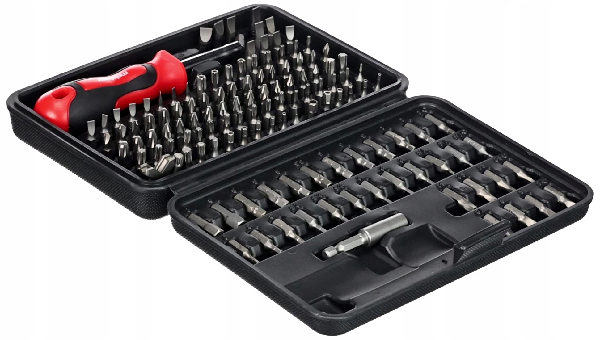 'PRZEGLĄD ZAWARTOŚCI: 130 części | Uchwyt wkrętarski | Magnetyczny uchwyt na bity | 91 x standardowy bit (płaski, Phillips, Pozidriv, Tx, sześciokąt) | 36 x bit zabezpieczający (Torx TR, sześciokąt TR, klucz Z, kwadratowy, trójskrzydłowy, wielozębny) | Bit do wkrętaków hakowych'