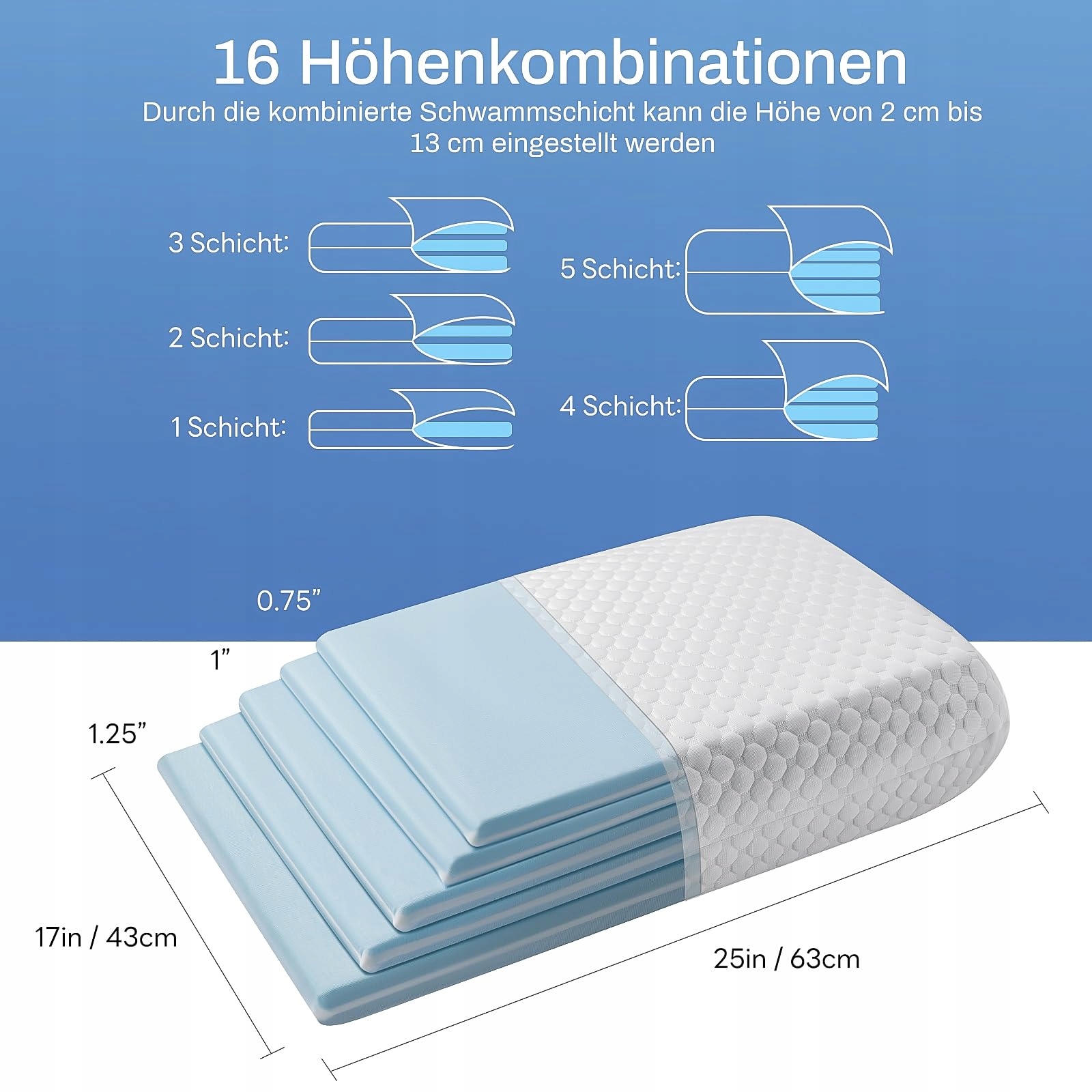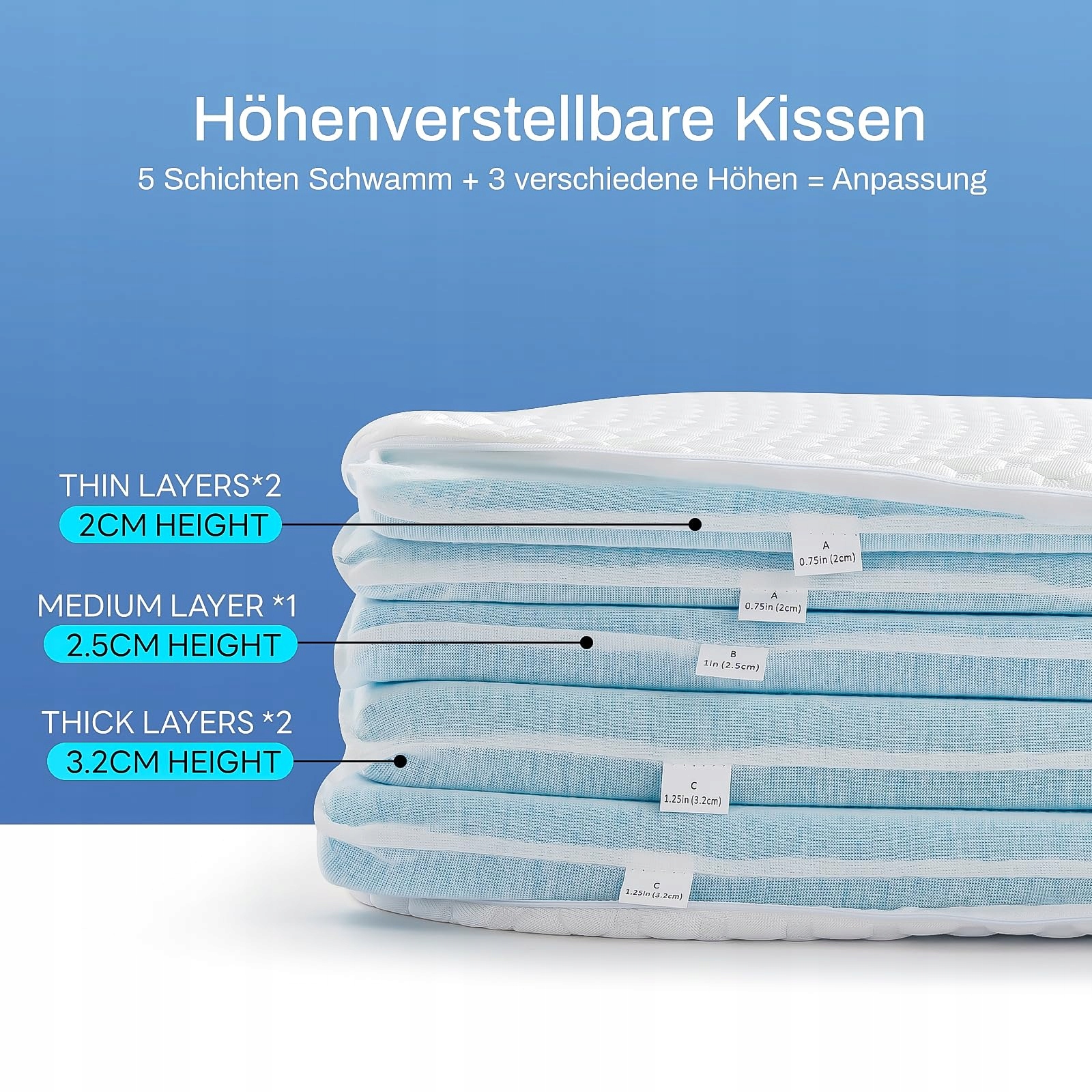 Regulowana wysokość 16 poziomów dla wszystkich śpiących: Poduszka z pianki memory foam Metergod zawiera 5 indywidualnych warstw pianki memory foam o różnych wysokościach, dzięki czemu możesz dostosować wysokość poduszki od 2 cm do 13 cm w dokładnych krokach po 2 cm. Możesz dokładnie dostosować poduszkę podpierającą szyję do swoich potrzeb