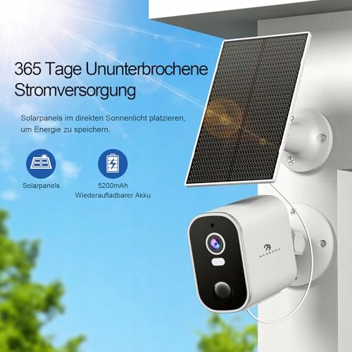 【Bezprzewodowa instalacja i energia słoneczna】Ta kamera zewnętrzna jest zasilana wydajnym panelem solarnym i akumulatorem 5200 mAh. Odłączany panel z kablem o długości 2,2 m umożliwia elastyczną instalację i zapewnia stałe zasilanie, dzięki czemu akumulator po pełnym naładowaniu działa od 1 do 3 miesięcy.