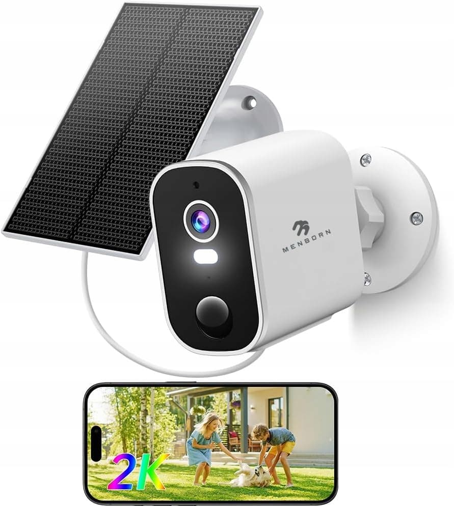 Menborn 2K/4MP Kamera monitoringu zewnętrznego na akumulator z panelem solarnym, 2,4GHz WLAN Bezprzewodowa kamera zewnętrzna z kolorowym trybem nocnym, dwukierunkowym audio, reflektorami, kompatybilna z Alexą, IP65