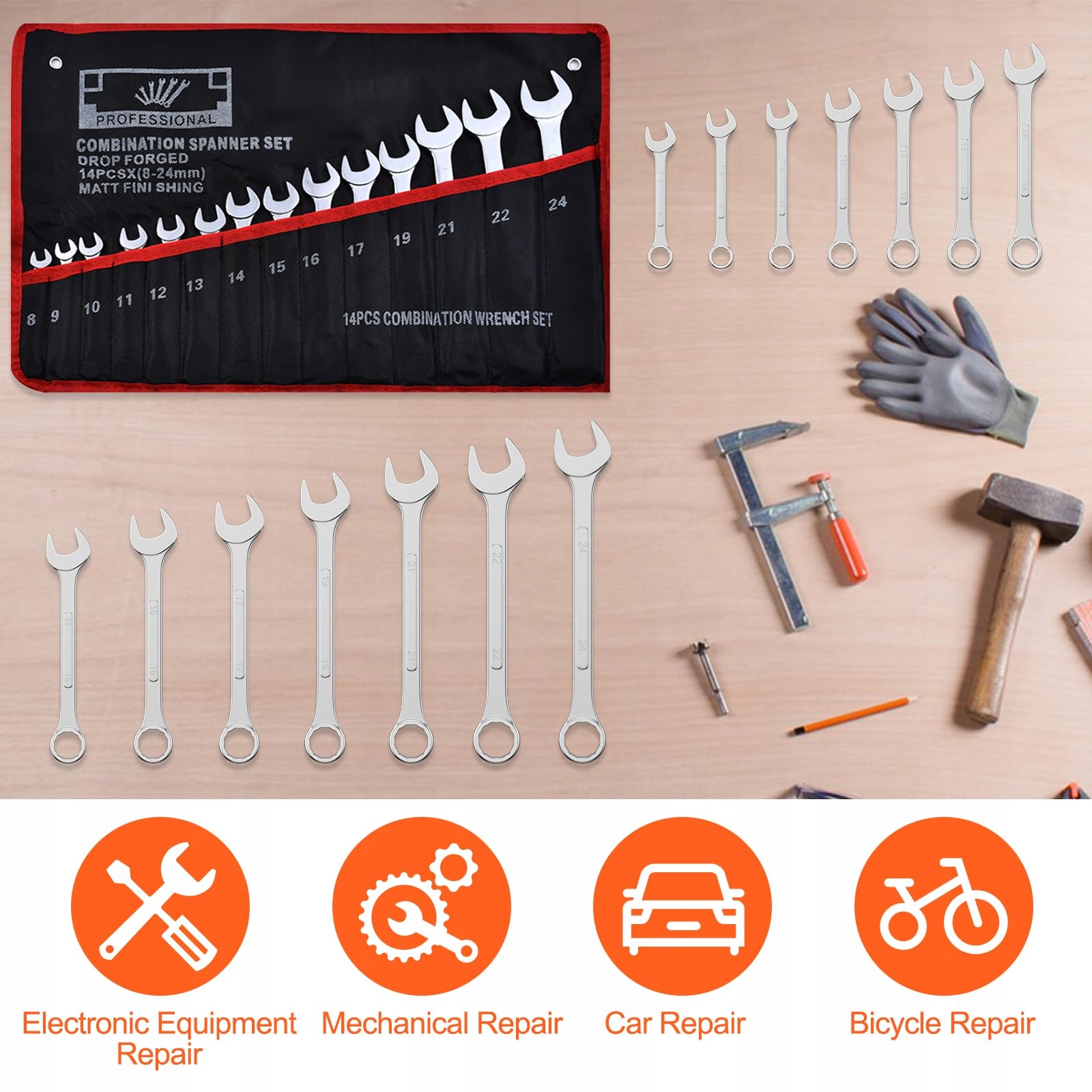 Mesybveo 14 sztuk zestaw kluczy nasadowych, 8-24 mm klucze oczkowe klucze płaskie zestaw ze stali chromowo-wanadowej, w torbie, klucze z 12 zębami do mocowania i demontażu