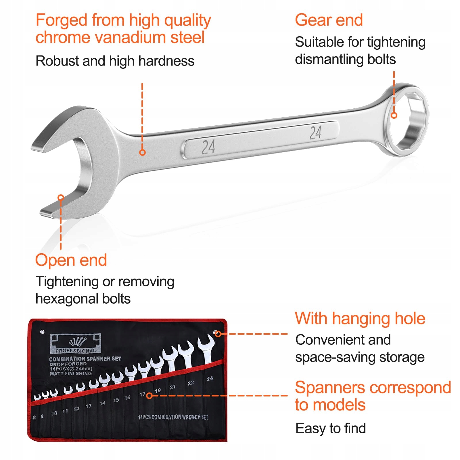 [Standardowy rozmiar] Pakiet zawiera 14 kluczy wielofunkcyjnych w rozmiarach: 8mm, 9mm, 10mm, 11mm, 12mm, 13mm, 14mm, 15mm, 16mm, 17mm, 19mm, 21mm, 22mm, 24mm, z różnymi rozmiarami, aby spełnić Twoje różne potrzeby, oznaczenia rozmiarów po obu stronach uchwytu dla łatwej identyfikacji rozmiaru