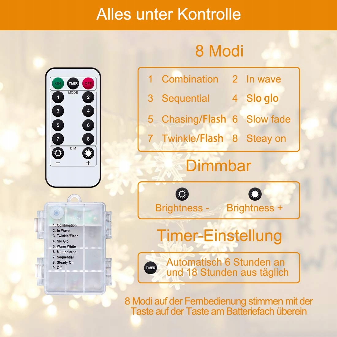 ❄【8 trybów ściemnianych łańcuchów świetlnych z pilotem】10 poziomów jasności i 8 trybów do wyboru: 1.Kombinacja 2.Fala 3.Sequencja 4.Powolne świecenie 5.Pogoń/Błysk 6.Powolne zanikanie 7.Błysk/Twierdzenie 8.Stałe światło. Ustaw łańcuch świetlny LED ciepłej bieli na timer na 6 godzin włączony i 18 godzin wyłączony, uzyskując aktualny tryb oświetlenia po ponownym włączeniu łańcucha świątecznego. Piękne łańcuchy świetlne do pokoju, sypialni, kominka, akademika, salonu.