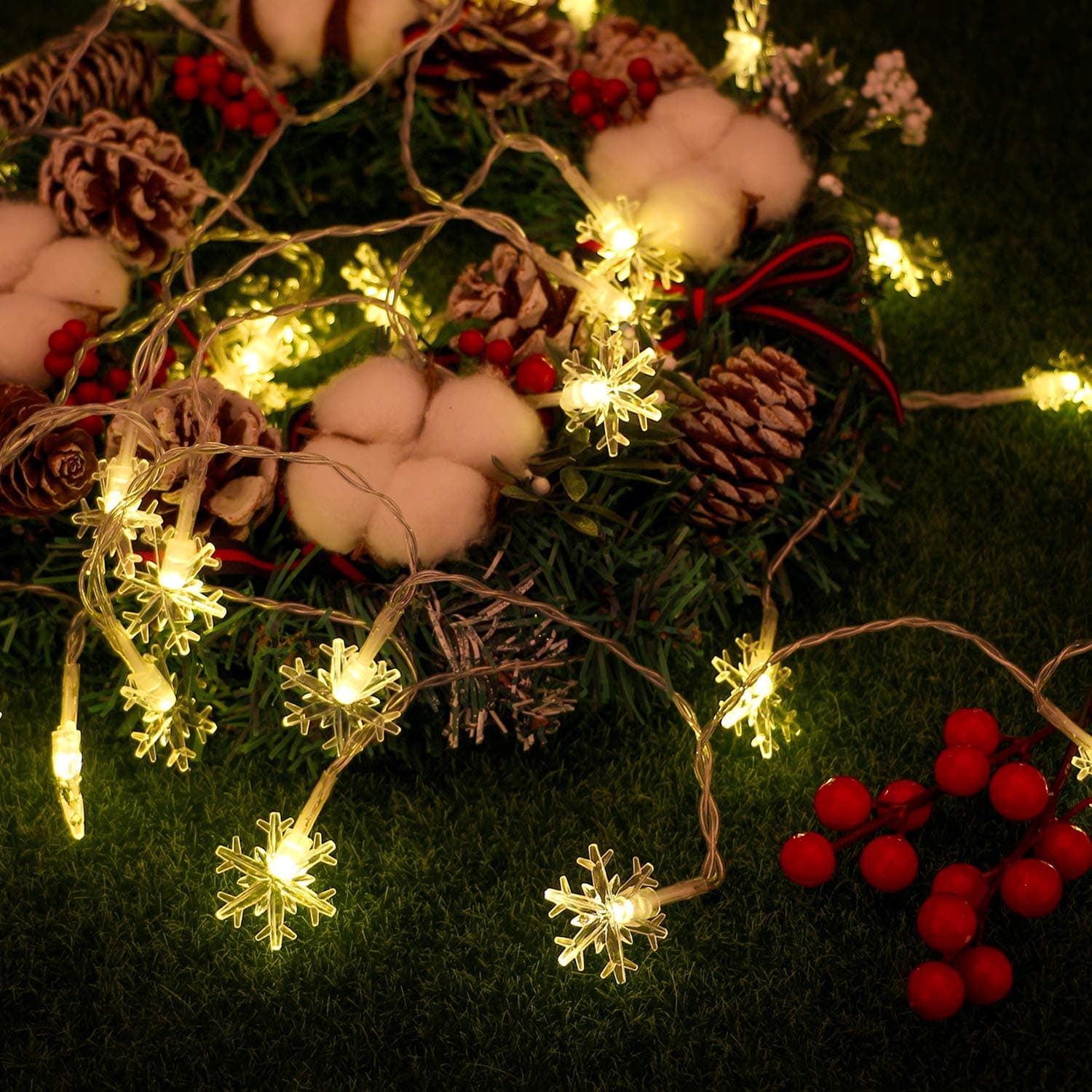 ❄【Ulepszony zewnętrzny łańcuch świetlny z płatkami śniegu】6m łańcuch świetlny LED z 40 super jasnymi diodami LED w kształcie płatków śniegu. Każdy płatek śniegu ma średnicę 35 mm. Jaka jest różnica? Oznacza to, że możesz uzyskać wyższą jasność i lepsze efekty świetlne. Ten łańcuch świetlny na baterie używa przezroczystej rurki do owinięcia przewodu, dopasowując go do stylu kryształowej kuli, co nie powoduje dziwnego wrażenia u ludzi.