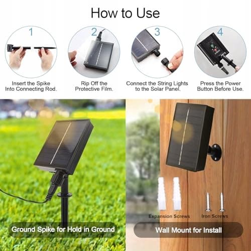 【Wodoodporne i funkcja pamięci】Zarówno łańcuchy świetlne solarne, jak i panel solarny mają klasę wodoodporności IP65, co czyni je idealnymi do użytku wewnątrz i na zewnątrz bez obaw o wilgoć, uszkodzenia pogodowe czy zwarcia. Przy niskim napięciu brak przegrzewania po wielu godzinach użytkowania. Łańcuchy świetlne solarne z wbudowanym chipem pamięci automatycznie zapamiętują ostatnie ustawienia, oszczędzając Ci konieczności ponownego ustawiania.