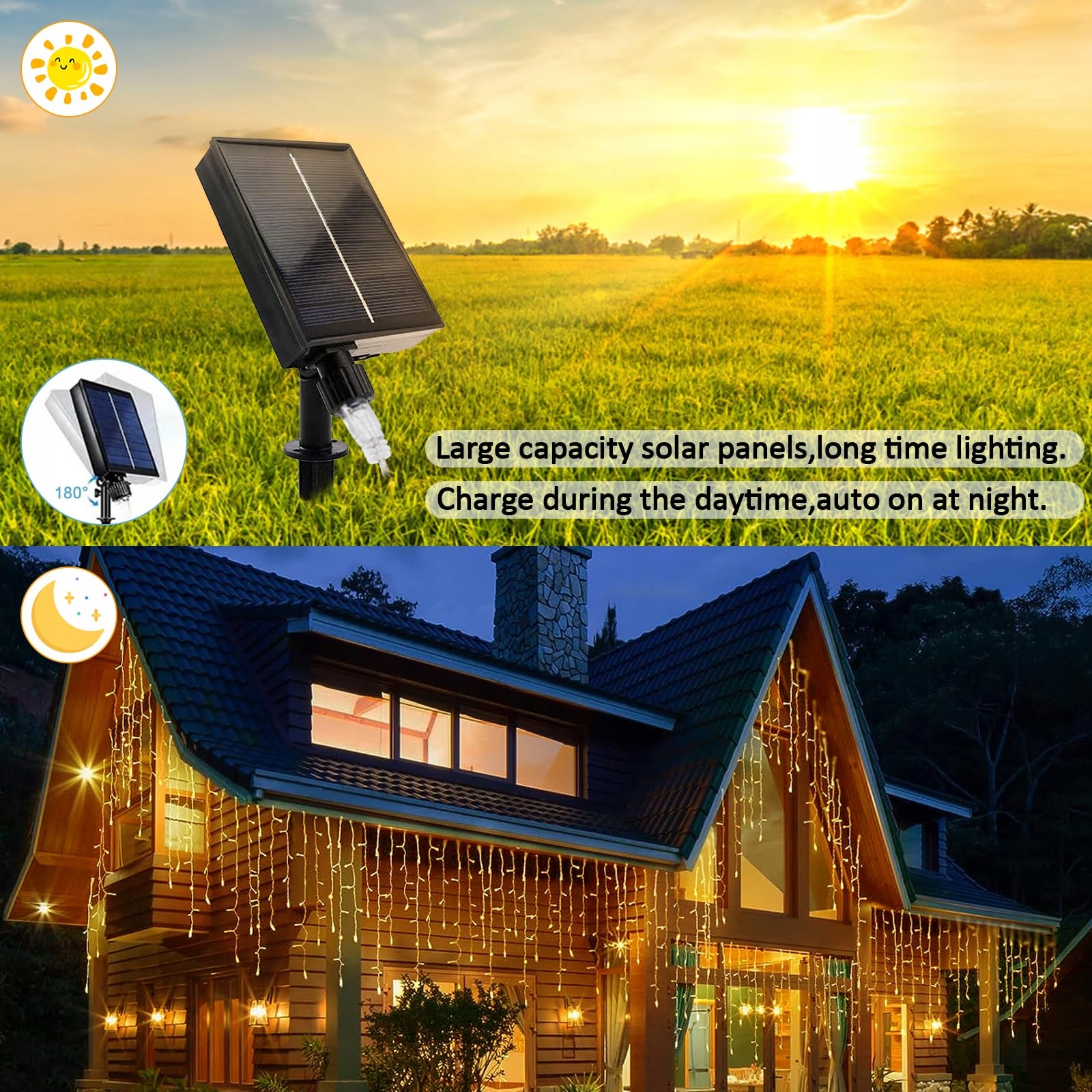 [Solarne lampki kurtynowe]Solarne lampki kurtynowe mają 264 diody LED. 44-strunowe wiszące lampki kurtynowe, 22-strunowe lampki mają długość 0,5M/1,64ft, 22-strunowe lampki mają długość 0,7M/2,3ft. Z dodatkowym przewodem o długości 2M/6,6ft. Piękne lampki łańcuchowe dodają blasku miejscu, niezależnie od tego, czy to wydarzenie takie jak wesele, czy zwykłe spotkanie.