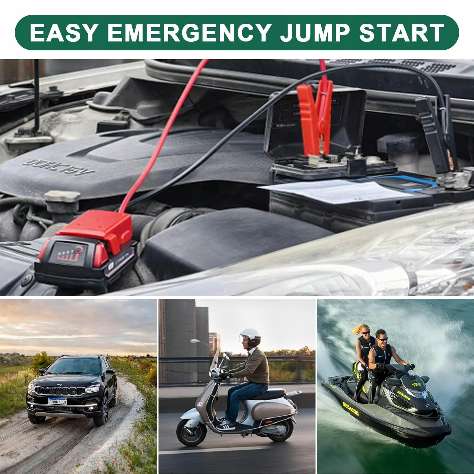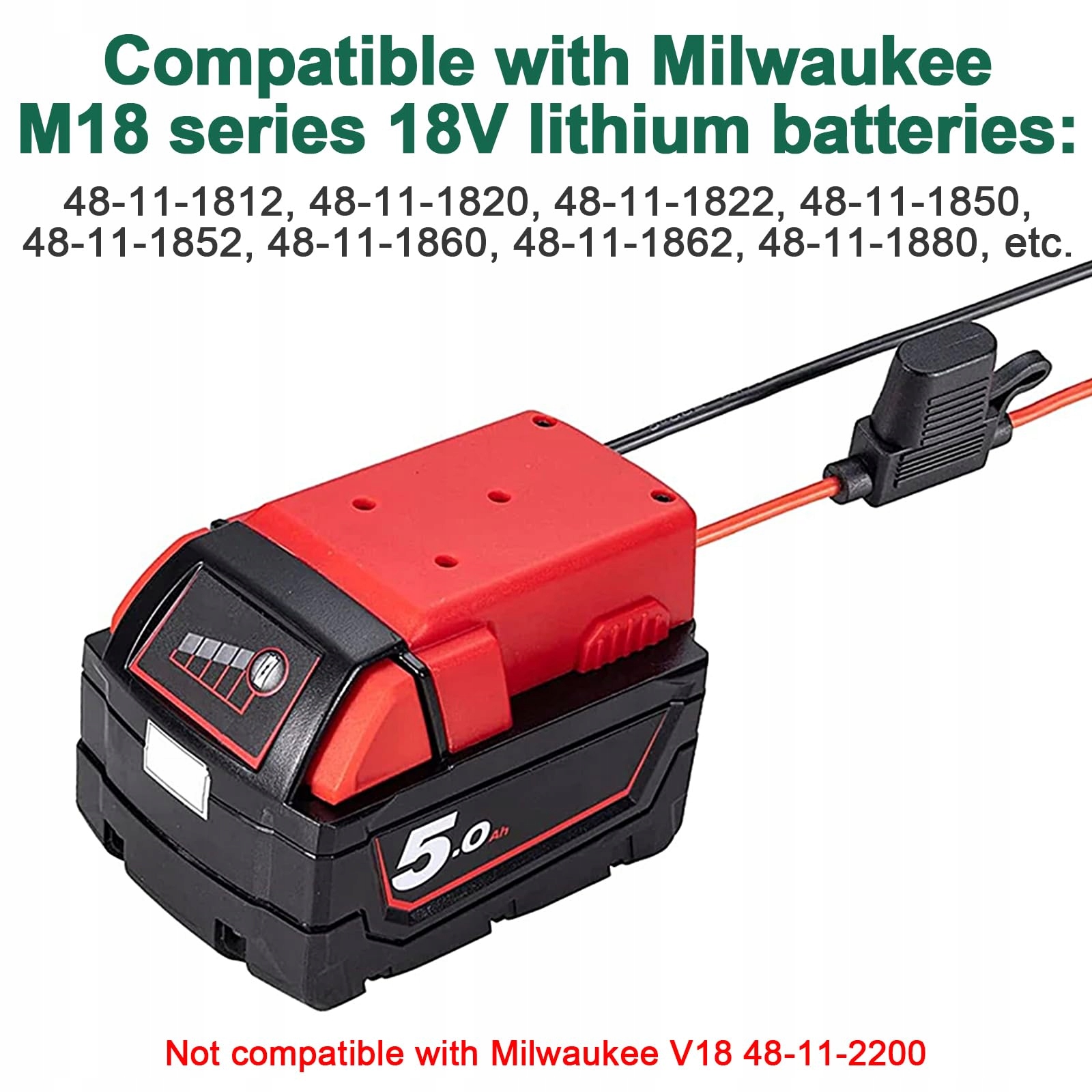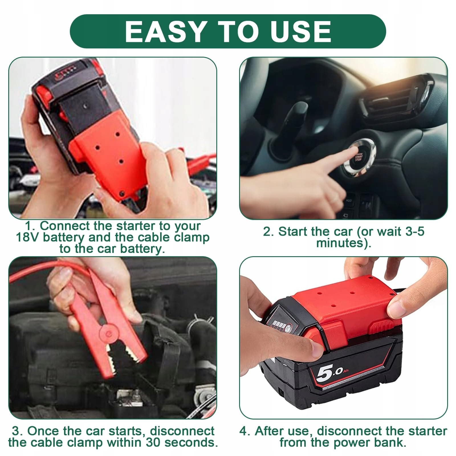 🔋【Kompatybilny z Milwaukee M18 18V akumulatorami】Ten adapter rozruchowy jest idealnie kompatybilny z akumulatorami litowymi Milwaukee M18 18V: modele 48-11-1812, 48-11-1820, 48-11-1822, 48-11-1850, 48-11-1852, 48-11-1860, 48-11-1862, 48-11-1880 itd. (Akumulatory nie są dołączone).