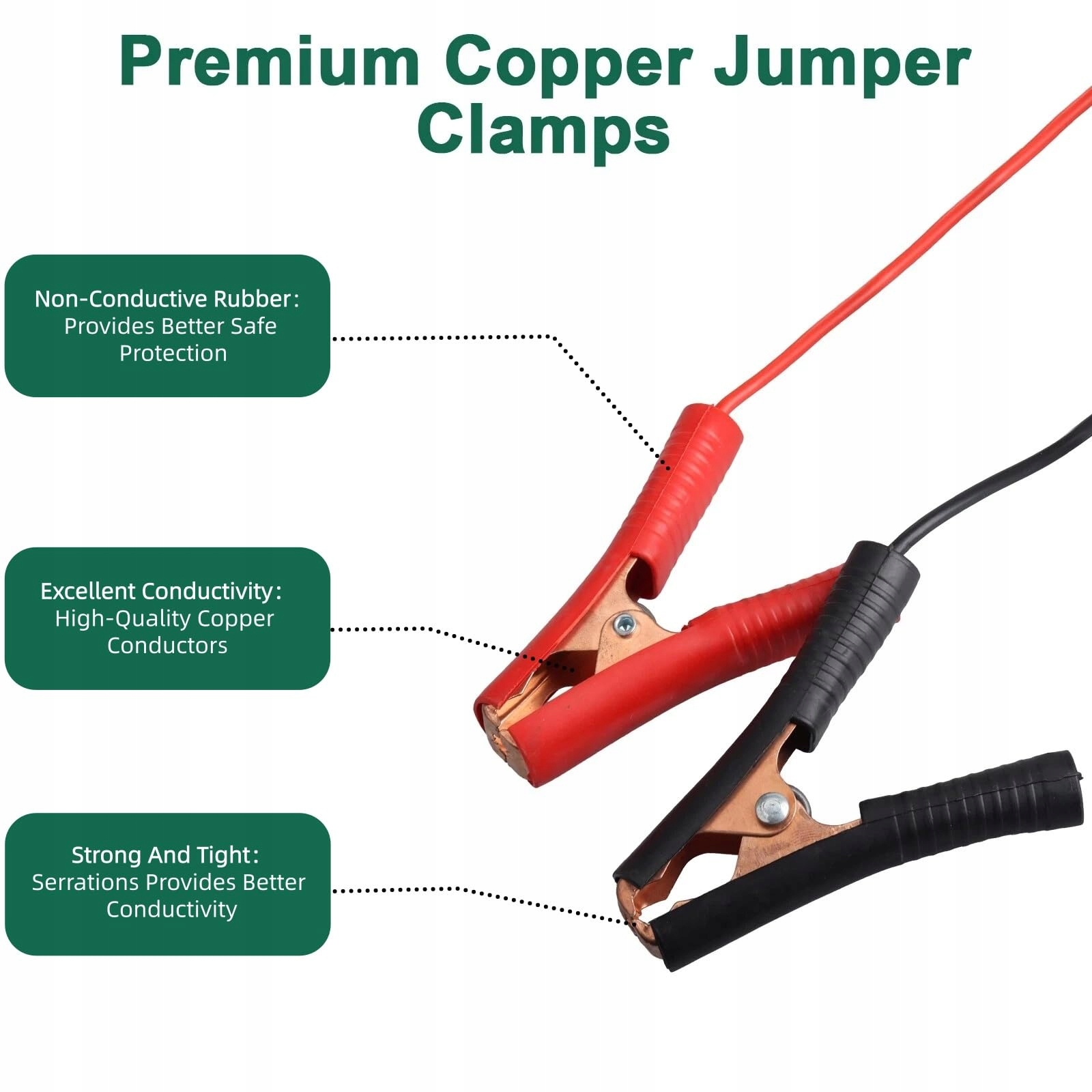 ⚙️【Wysokiej Jakości Materiały】Obudowa zewnętrzna wykonana z odpornego na ścieranie tworzywa ABS; rdzeń przewodu miedzianego cynowanego 14 AWG zapewnia doskonałą przewodność; dwa zaciski krokodylkowe z mocnym, ząbkowanym blokowaniem i mechanizmem sprężynowym są pokryte izolującą gumową osłoną; zintegrowany system ochrony przed zwarciem oraz bezpiecznik 30A topi się automatycznie przy przeciążeniu, chroniąc akumulator i akumulator samochodowy.
