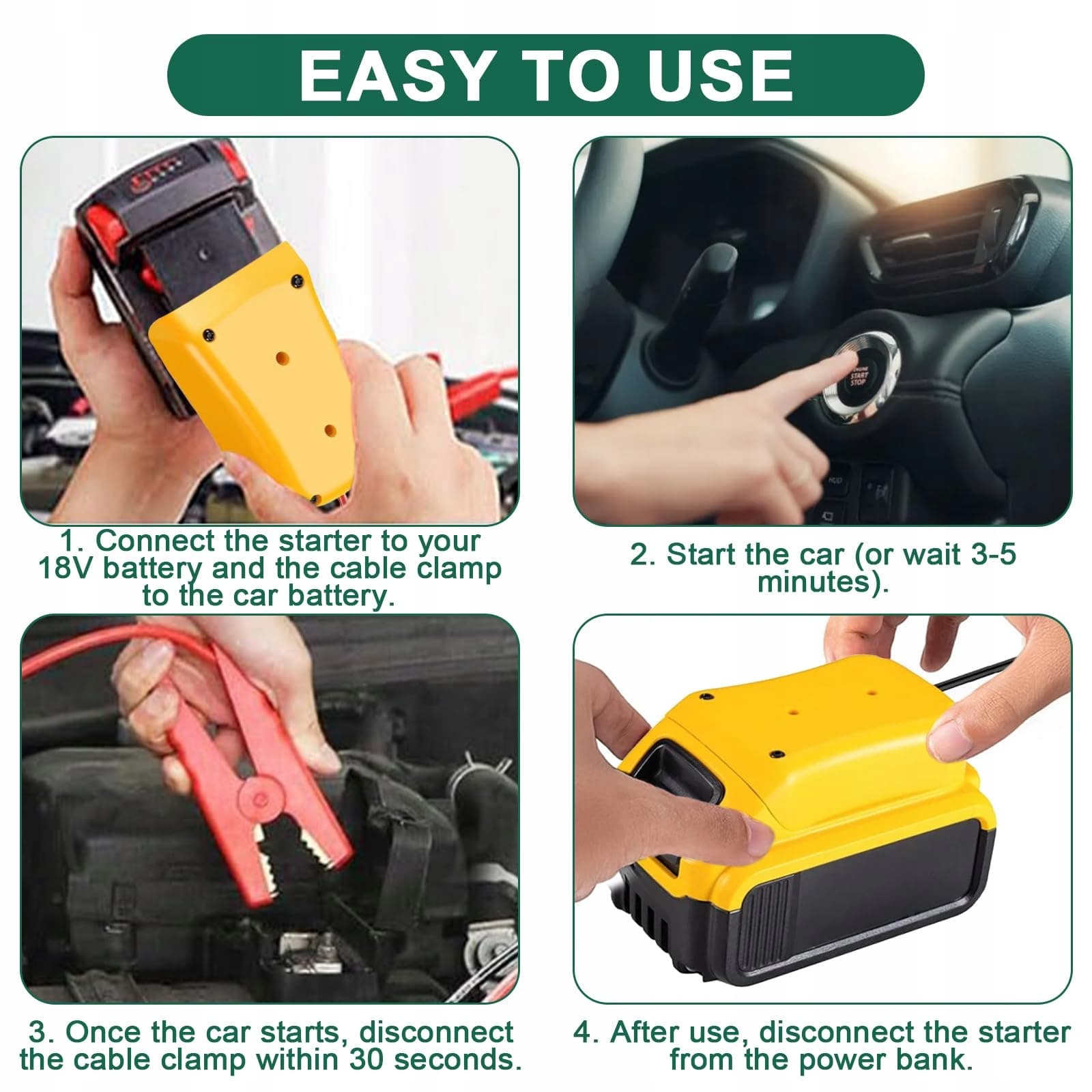 📌【Łatwa Obsługa】1. Podłącz akumulator DeWalt, przy czym czerwony zacisk podłącz do bieguna dodatniego (+) akumulatora samochodowego, a czarny zacisk do bieguna ujemnego (-). 2. Uruchom samochód (w przypadku mocno rozładowanego akumulatora odczekaj 3–5 minut przed uruchomieniem). 3. Odłącz zaciski kabli w ciągu 30 sekund po uruchomieniu pojazdu. 4. Po użyciu odłącz rozrusznik od akumulatora.