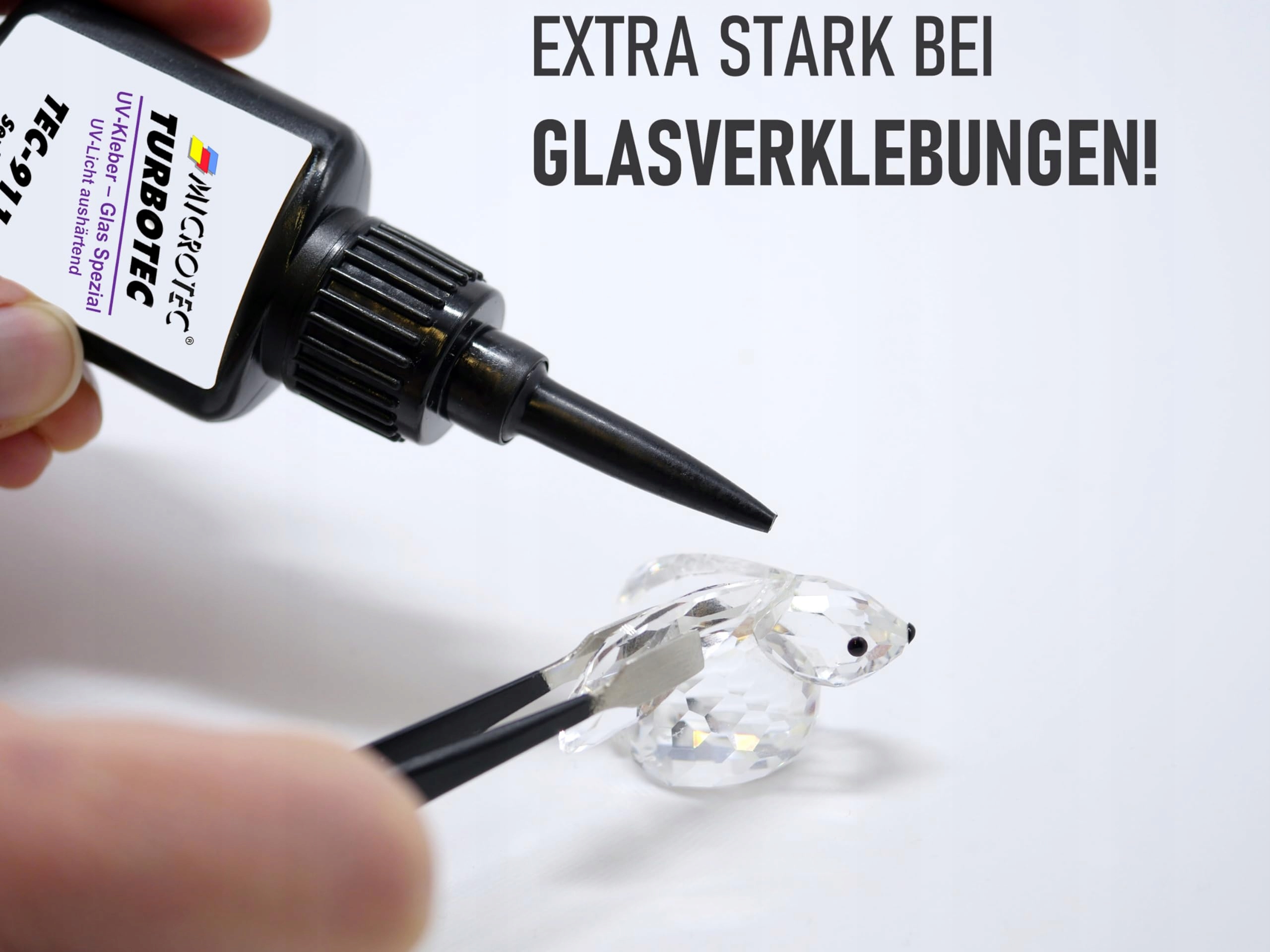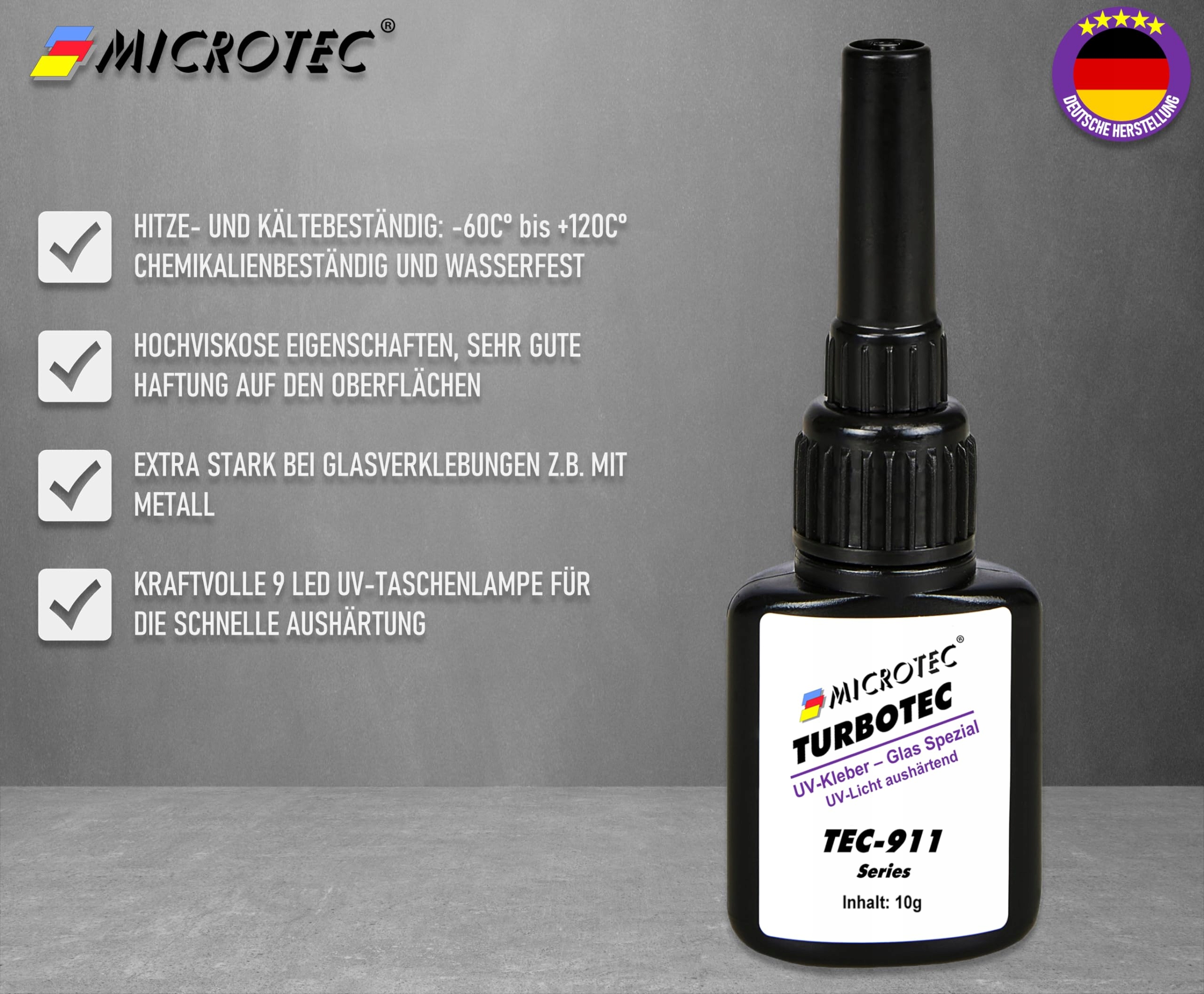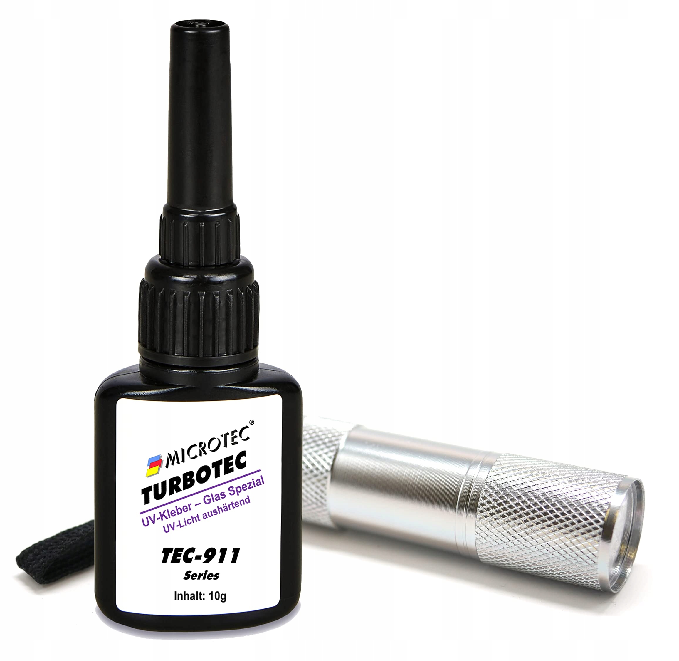 Microtec® Turbotec 911 Klej specjalny UV do szkła | ekstra mocny do szkła/metalu | 10g | z latarką UV | utwardzający światłem i przezroczysty klej | produkt wysokiej jakości z Niemiec