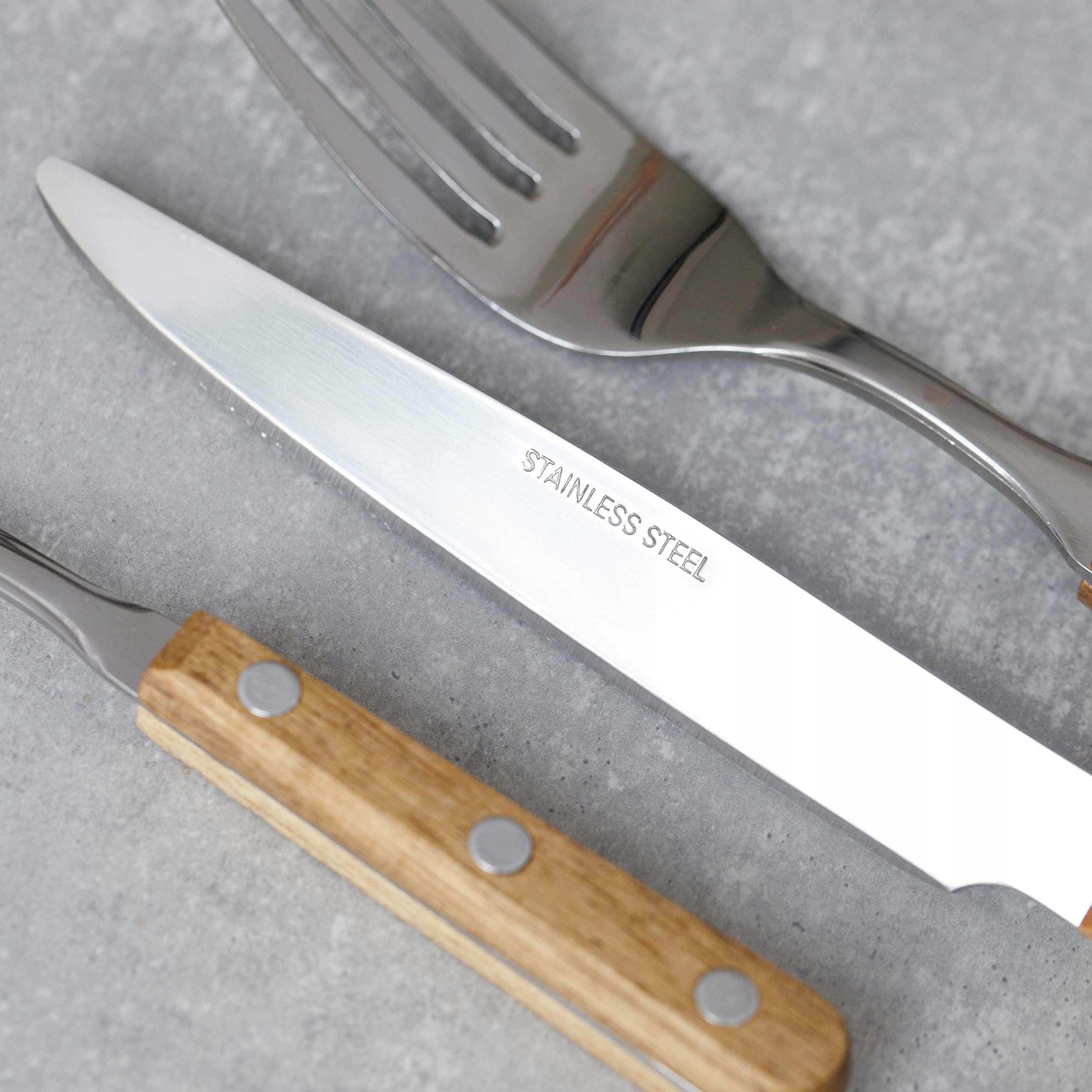 Trwałe sztućce - Ten zestaw sztućców nadaje się do mycia w zmywarce, ma potrójnie nitowane drewniane uchwyty i stal nierdzewną, co czyni go wytrzymałym na codzienne użytkowanie przez lata