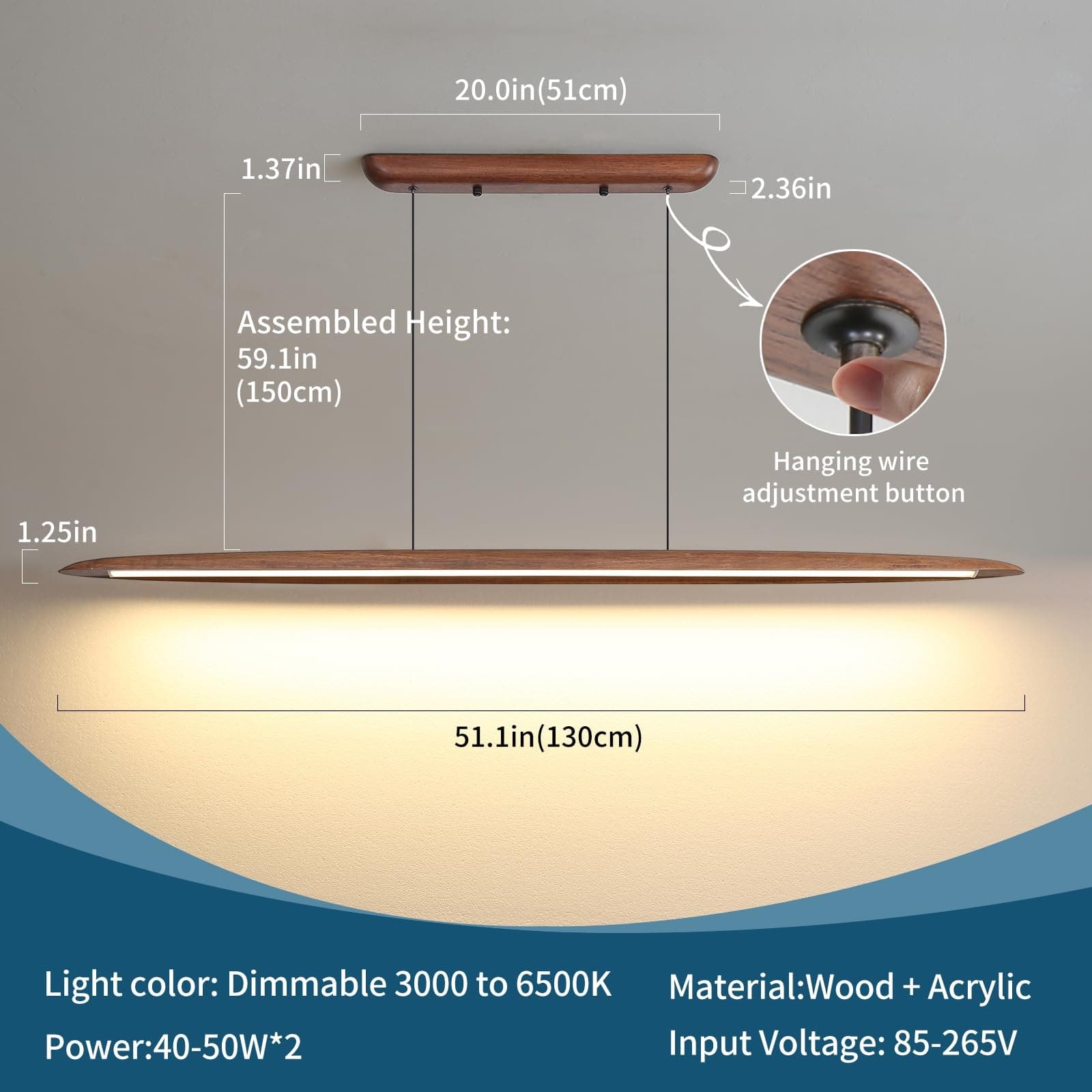 【REGULOWANA WYSOKOŚĆ】Nowa liniowa lampa do jadalni ma 2 regulowane przewody. Po prostu naciśnij czarny przycisk, który łączy kabel z podsufitką, i pociągnij za kabel, aby ustawić wysokość. Zakres wysokości tego żyrandola można ustawić na 1-150CM. Możesz dostosować ten żyrandol w zależności od swojego miejsca zamieszkania i potrzeb oświetleniowych.