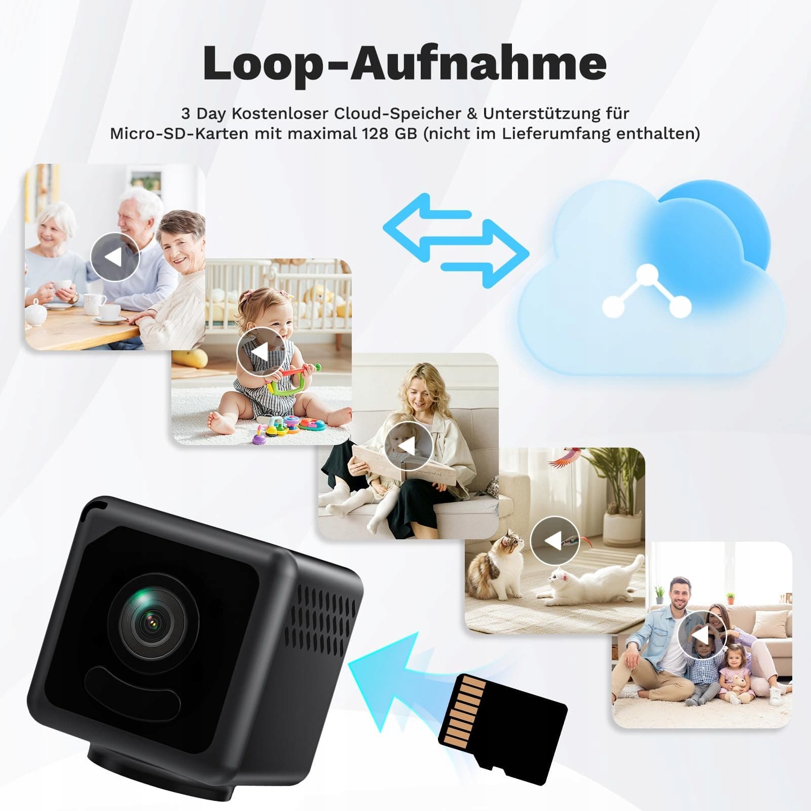 Elastyczne lokalne i chmurowe przechowywanie: ta kamera VOY obsługuje kartę SD (pusta) oraz przechowywanie w chmurze (w zależności od subskrypcji). Przestrzeń dyskowa w chmurze zapewnia, że twoje wideo nigdy nie zostanie utracone i zawsze możesz je odzyskać oraz obejrzeć w dowolnym momencie