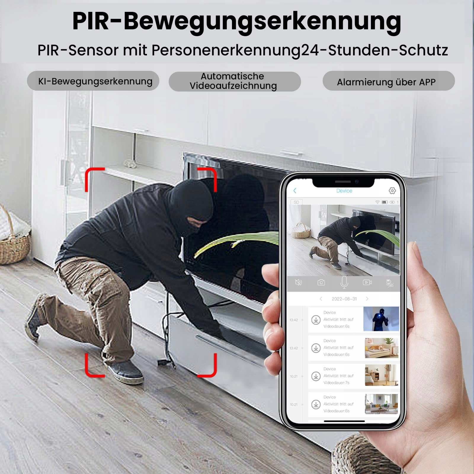 Detekcja ruchu PIR – ta mini kamera do monitoringu oferuje opcjonalny tryb nagrywania 24/7 z funkcją PIR, która wykrywa ruch osób i obiektów w czasie rzeczywistym. Gdy kamera wykryje ruch, natychmiast wysyła alarm przez aplikację mobilną.
