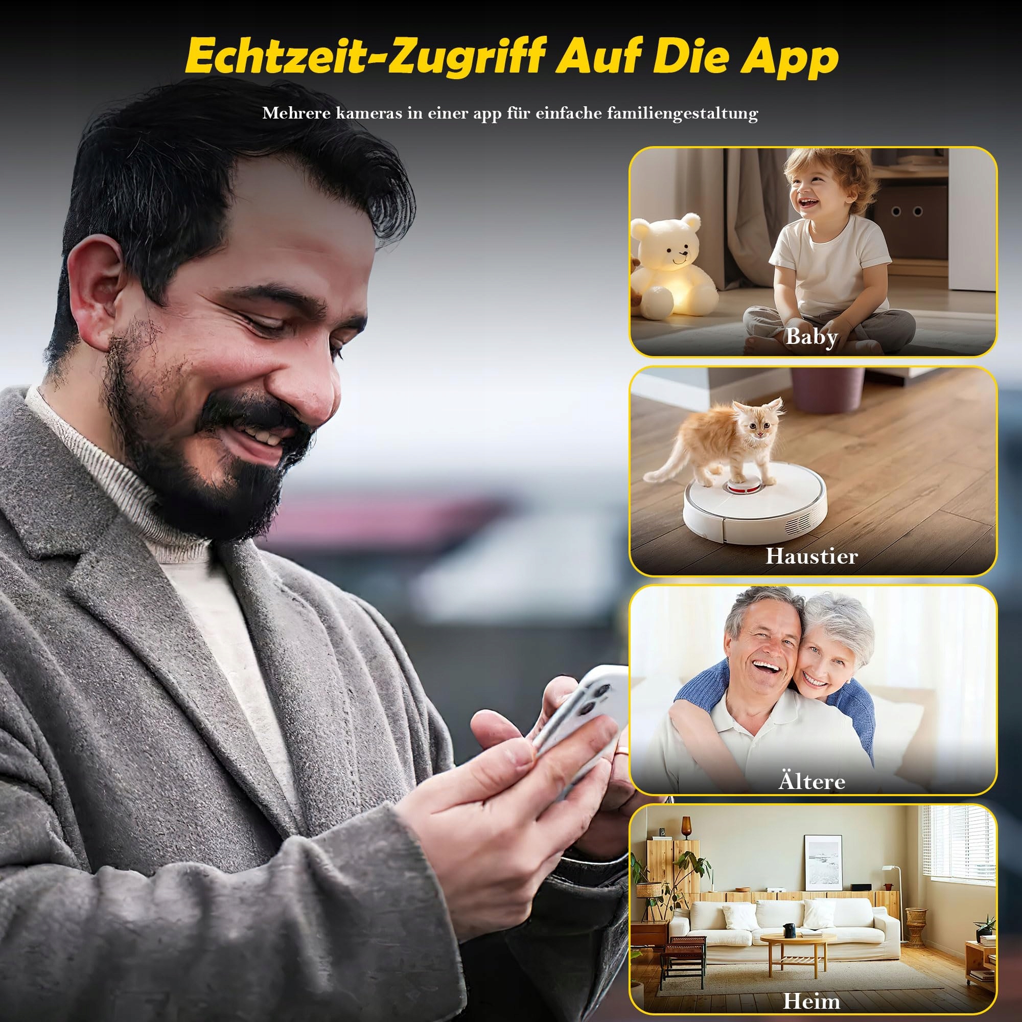 Prosta obsługa przez aplikację: Masz problemy z instalacją? Przyjazna dla użytkownika aplikacja umożliwia bezproblemowe bezprzewodowe połączenie i sterowanie, dzięki czemu możesz wygodnie obsługiwać kamerę WLAN wewnętrzną ze swojego smartfona. Jeśli często jesteś w podróży służbowej i tęsknisz za rodziną, teraz możesz po prostu otworzyć aplikację na telefonie i mieć dostęp do swojej mini kamery WLAN w dowolnym momencie.