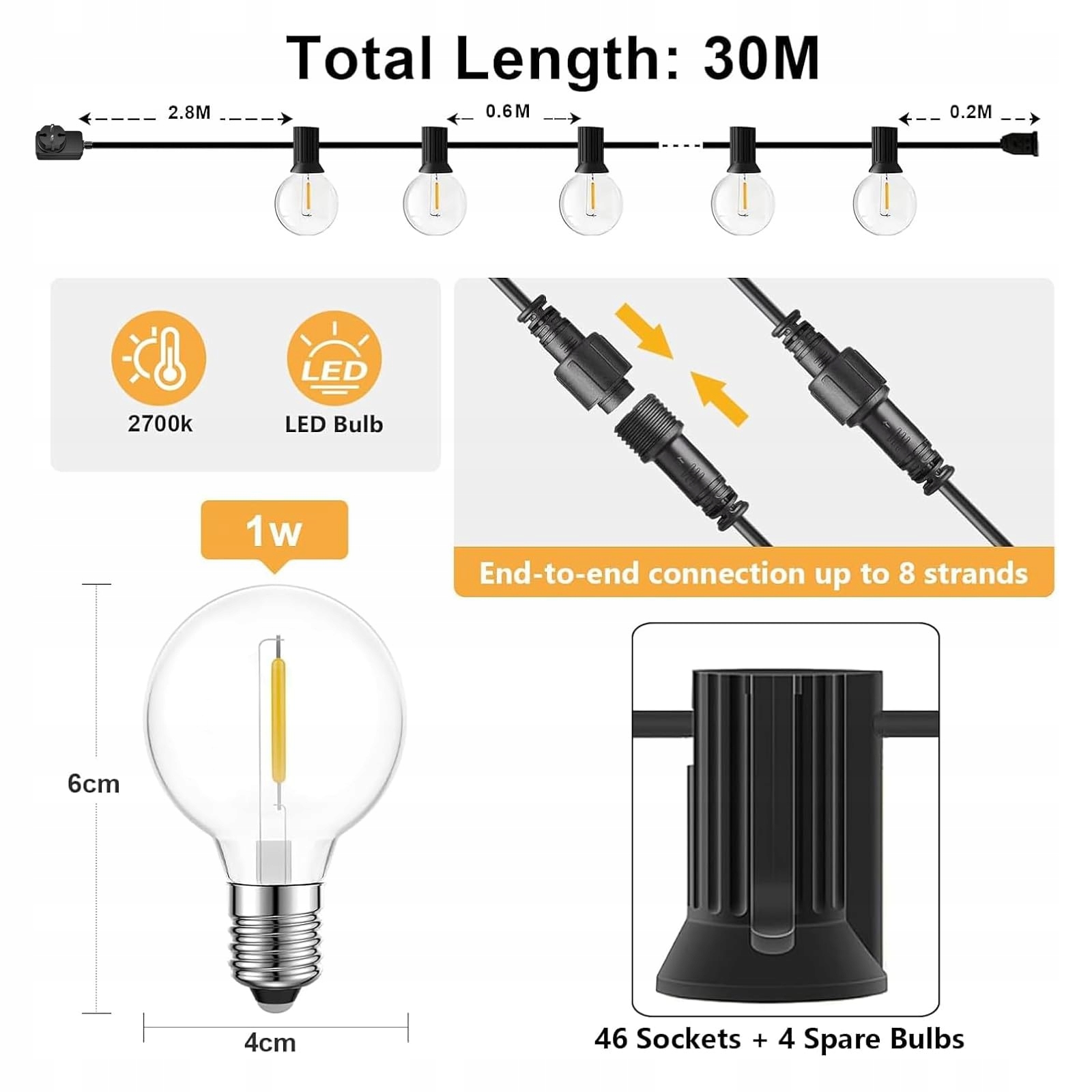 [Łatwe rozszerzanie i elastyczność] - 30-metrowy łańcuch świetlny można łączyć szeregowo, umożliwiając połączenie do 8 zestawów, co daje łączną długość 240 metrów. Idealny do stylowego oświetlania dużych obszarów, takich jak ogrody, podwórka i miejsca imprez. Odległość 2,8 metra między wtyczką a pierwszą żarówką oszczędza dodatkowe przedłużacze.