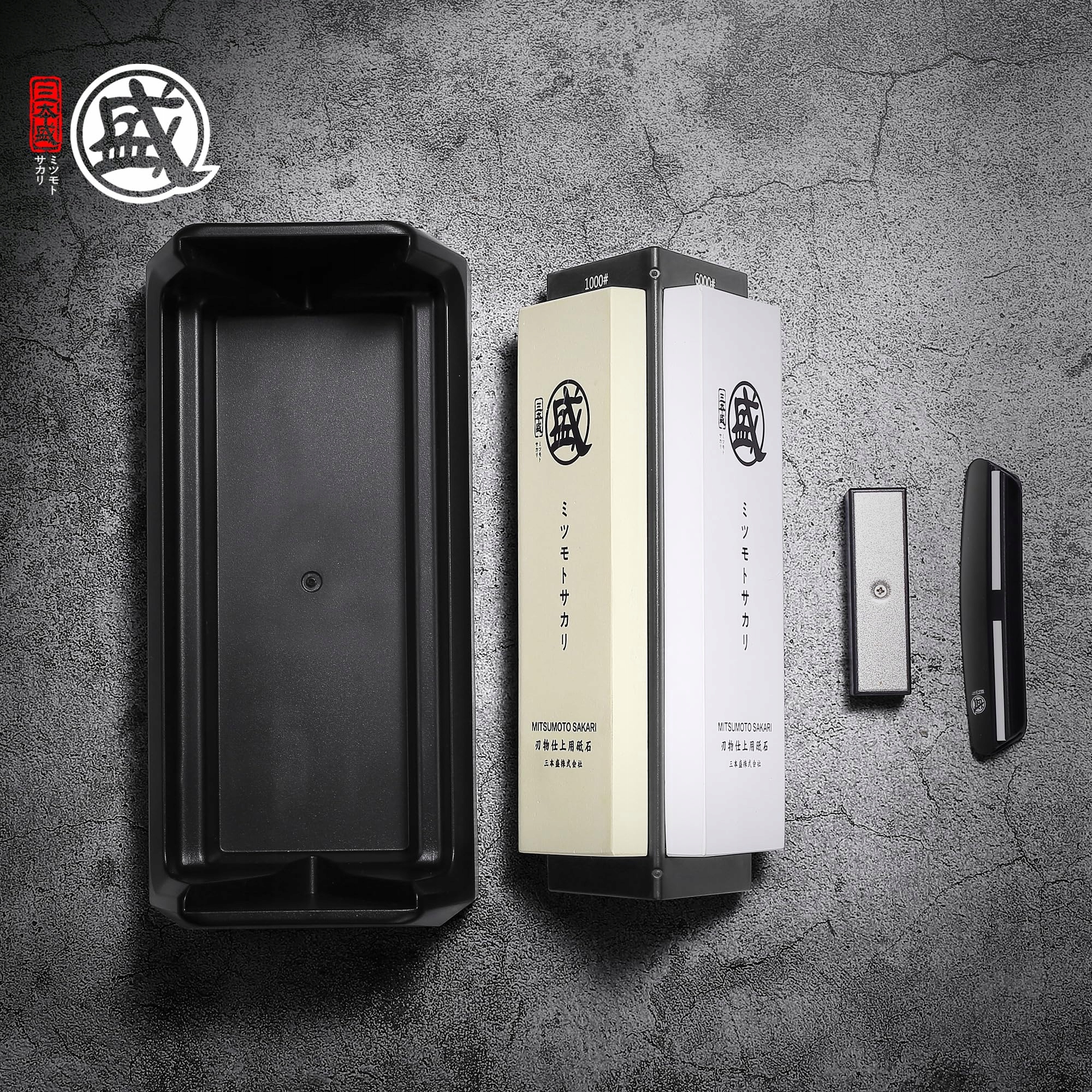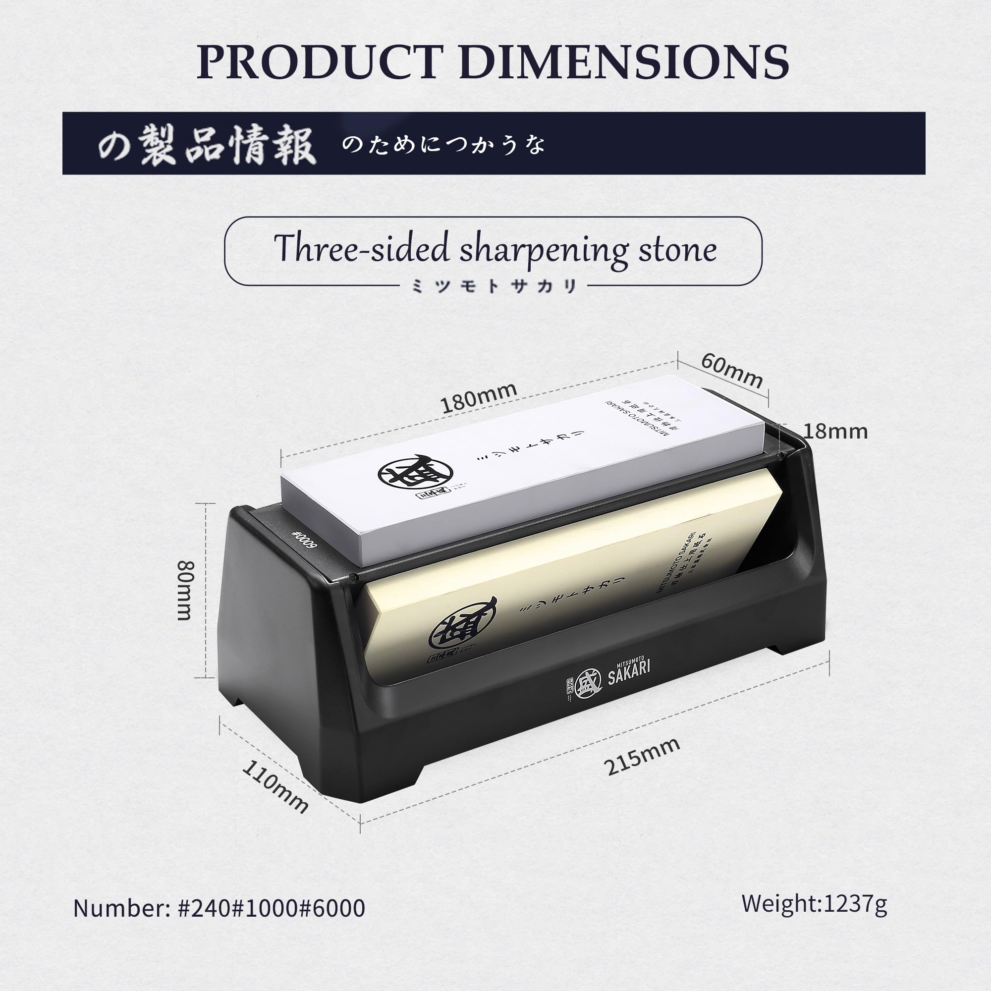 MITSUMOTO SAKARI Japoński kamień szlifierski do noży, kamień do ostrzenia 240/1000/6000 ziarnistości i precyzji, nowy trójstronny kamień szlifierski z antypoślizgową podstawą ABS