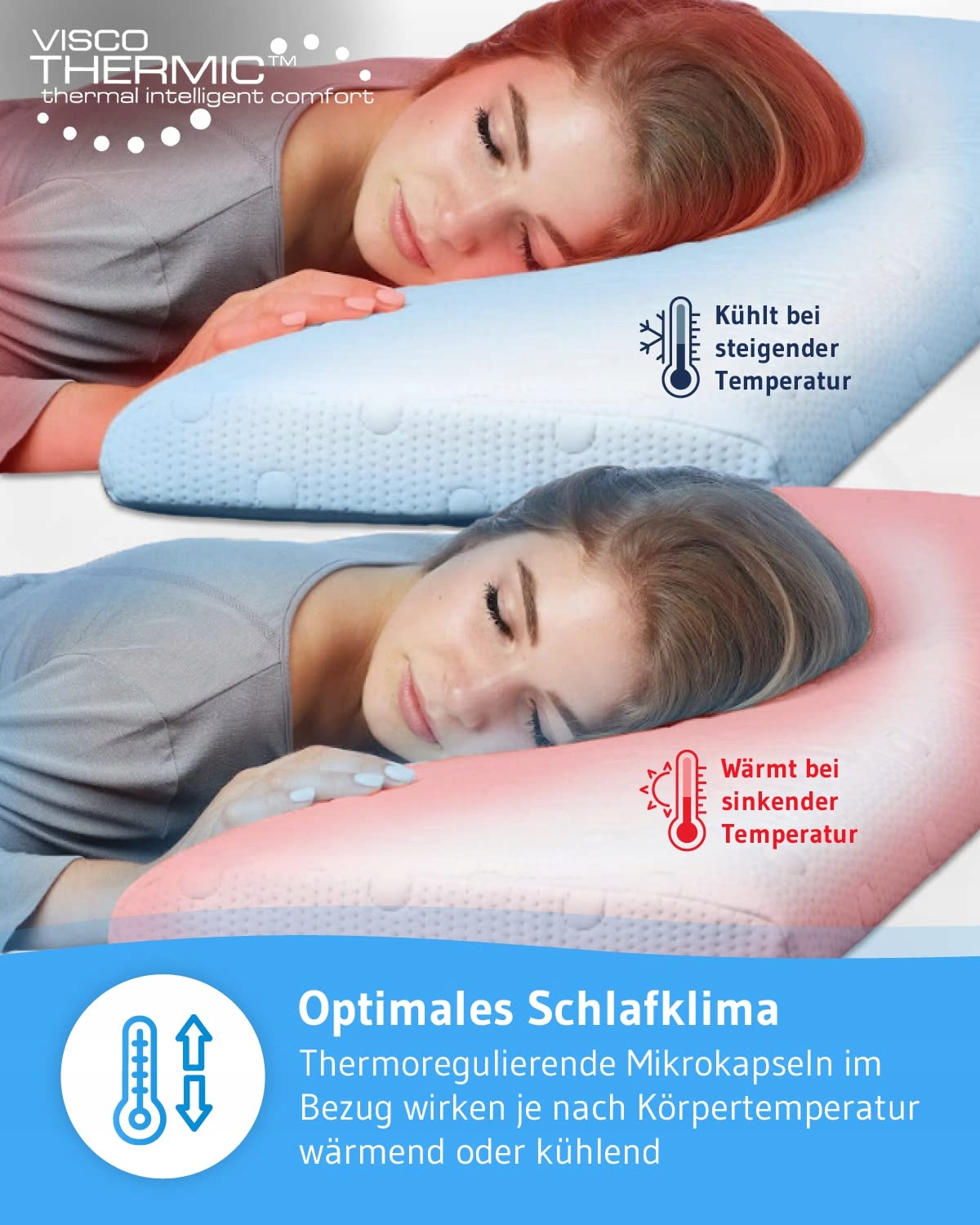 ➤ ZARZĄDZANIE CIEPŁEM I WILGOCIĄ: Termoregulujące mikrokapsułki w opatentowanym pokrowcu Thermic oraz kanały wentylacyjne wbudowane w poduszkę zapewniają optymalną wentylację i utrzymują zdrowy oraz świeży mikroklimat. To oznacza: mniej pocenia się i marznięcia podczas snu!