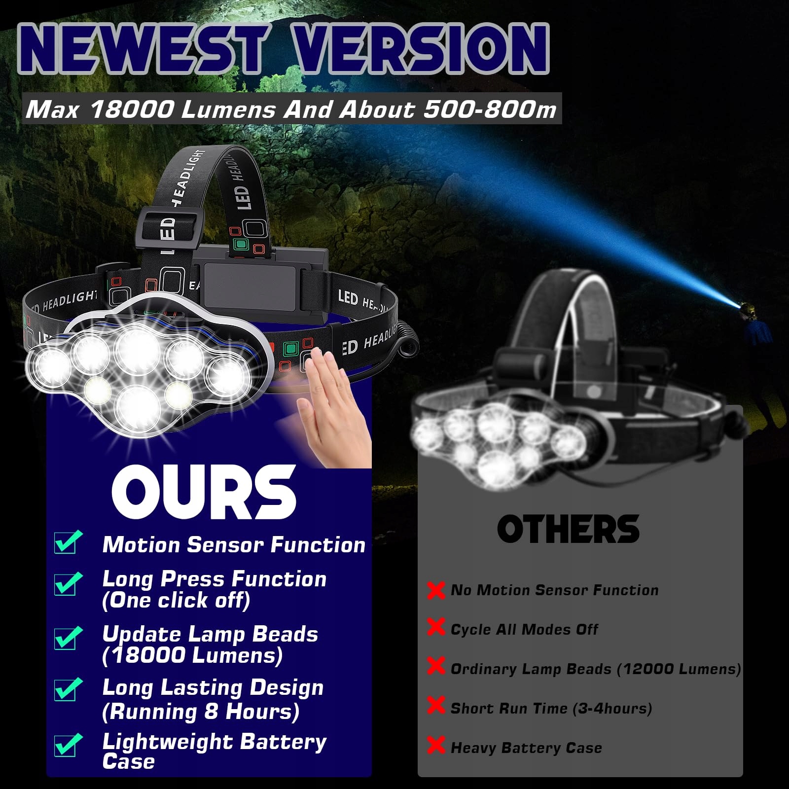NOWA FUNKCJA CZUJNIKA RUCHU, FUNKCJA DŁUGIEGO NACIŚNIĘCIA latarki LED: Nowa wersja, nasza latarka czołowa ma dodaną funkcję długiego naciśnięcia i czujnika ruchu. Kiedy naciśniesz i przytrzymasz przycisk trybu w dowolnym trybie, możesz bezpośrednio wyłączyć światło, nie musząc przechodzić przez wszystkie tryby. W trybie czujnika możesz sterować latarką czołową za pomocą ruchów ręki. Wysokowydajna latarka LED czołowa, solidna, trwała i lekka.