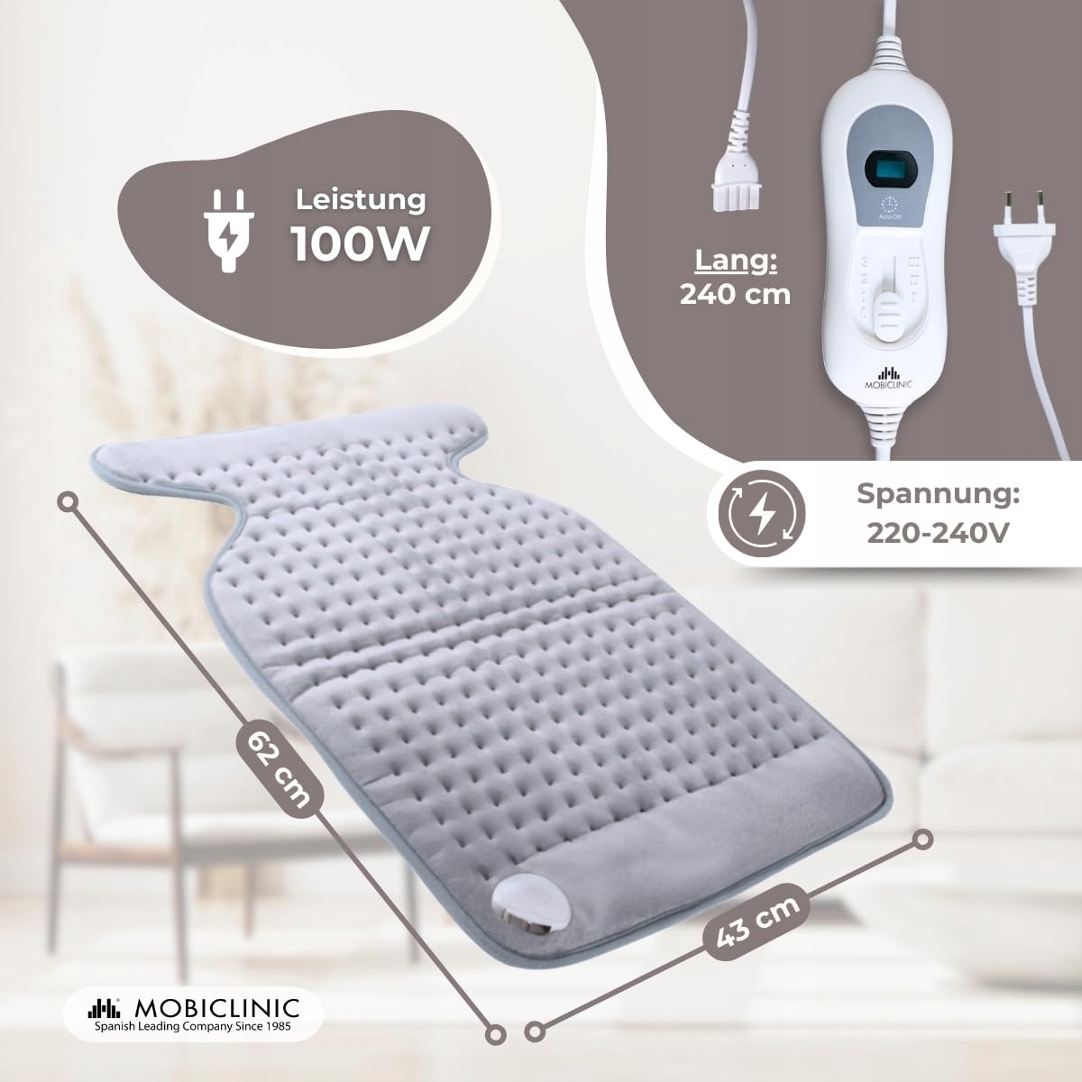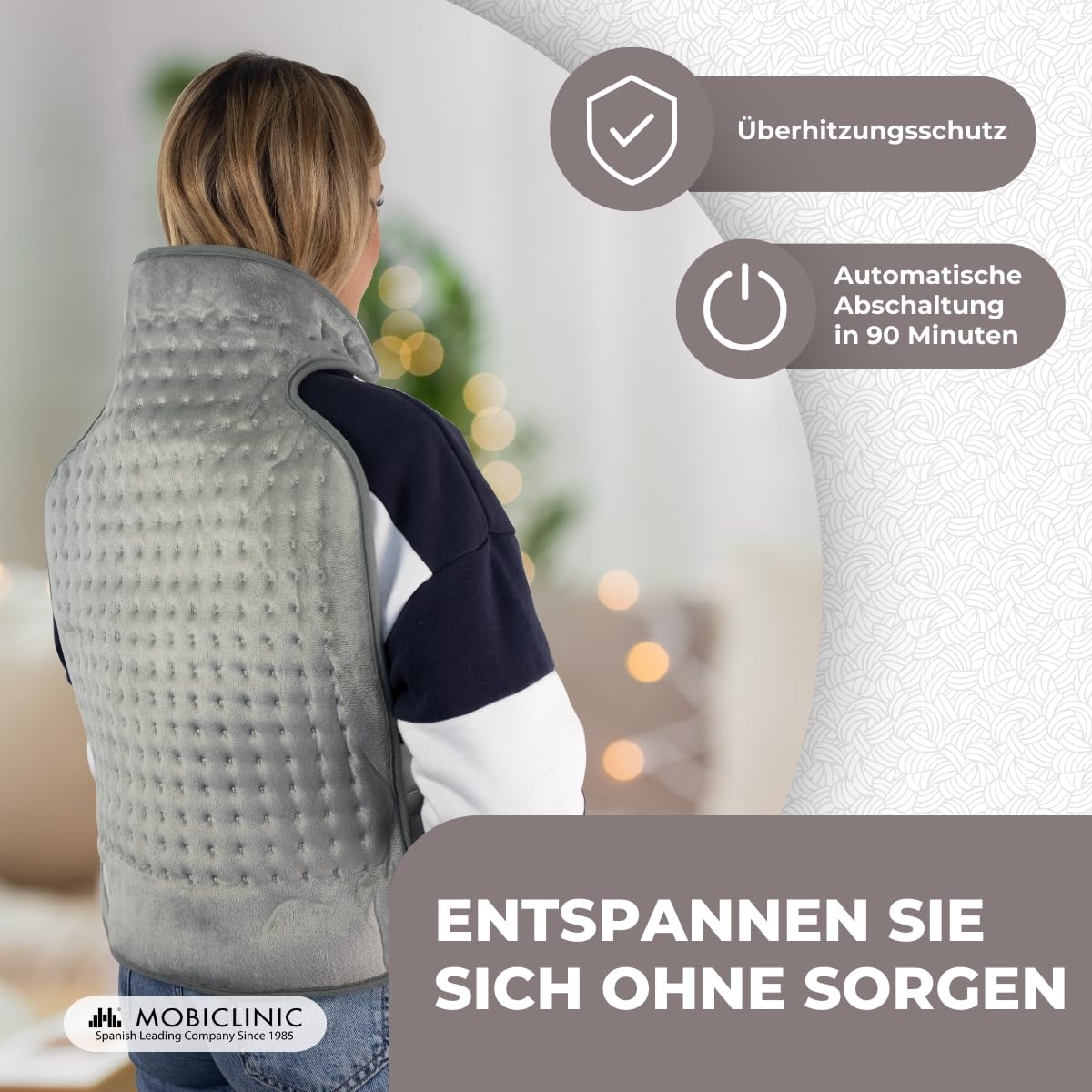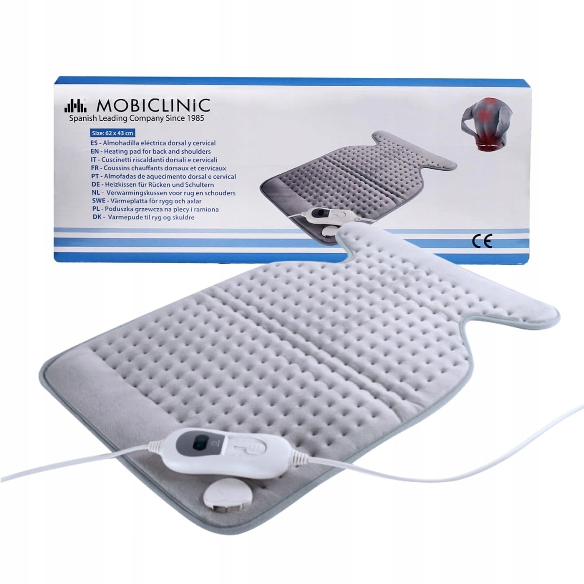 Mobiclinic®, poduszka grzewcza na plecy, ramiona, szyję, europejska marka, bardzo niskie zużycie, 3 poziomy temperatury, 62x43cm, mięśnie, szary