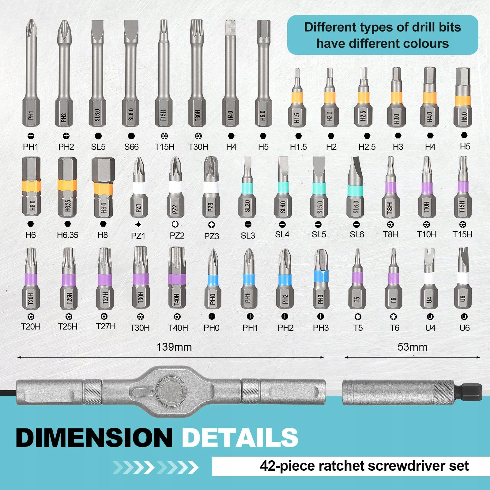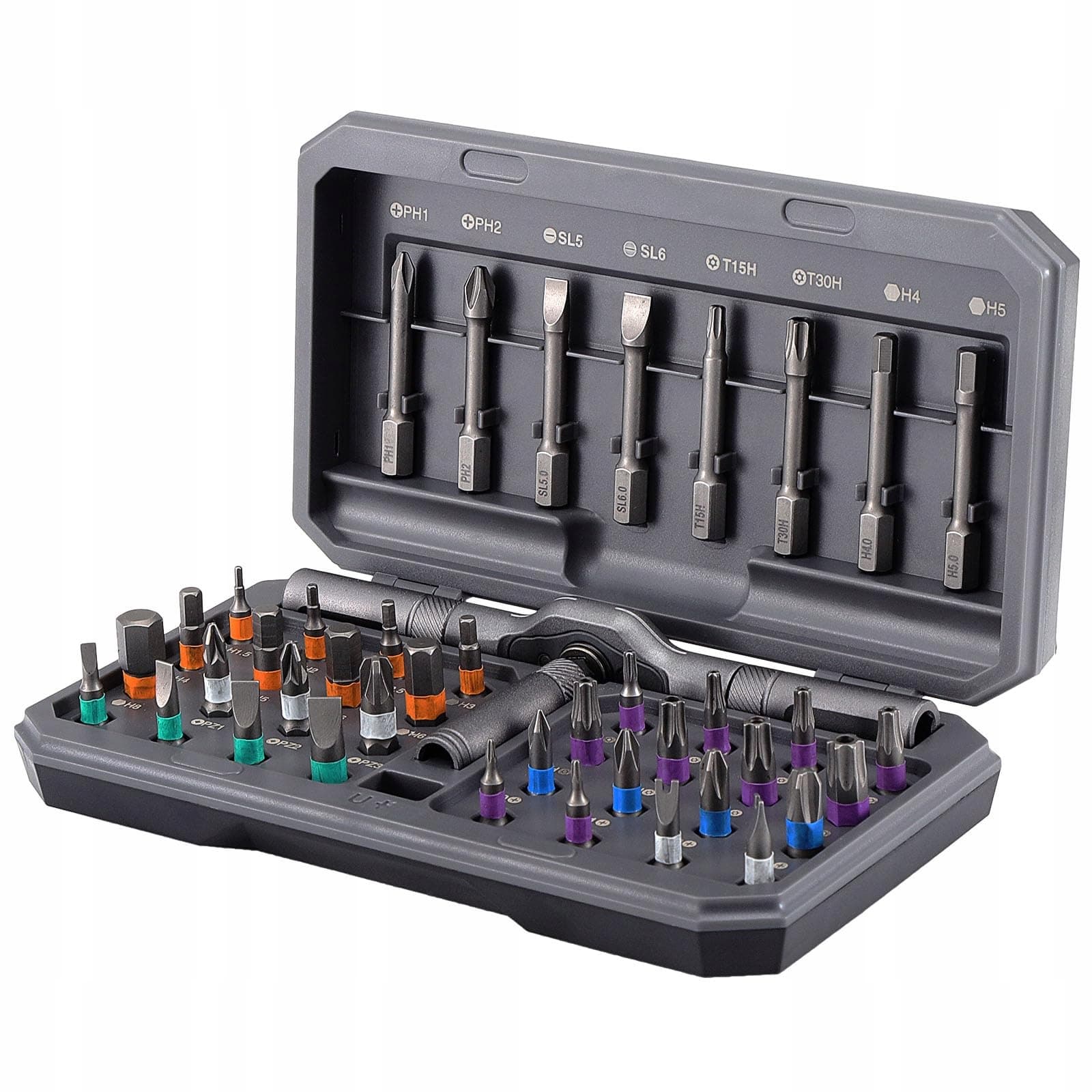 【Wielofunkcyjne akcesoria】: zestaw narzędzi precyzyjnych. Ten zestaw wkrętaków z grzechotką zawiera 8 sztuk 45 mm długich bitów wkrętaków i 32 sztuki 25 mm krótkich wkrętaków (PH, SL, Torx, Hex, zestaw narzędzi pc, PZ, wkrętaki zegarmistrzowskie U-kształtne itp.), wyposażony w różnorodne bity wkrętaków, które są odpowiednie do różnych typów śrub. Różne rodzaje wierteł mają różne kolory, aby można je było łatwo odróżnić. Komora akcesoriów bezpiecznie przechowuje wszystkie elementy akcesoriów i zapobiega ich zgubieniu.