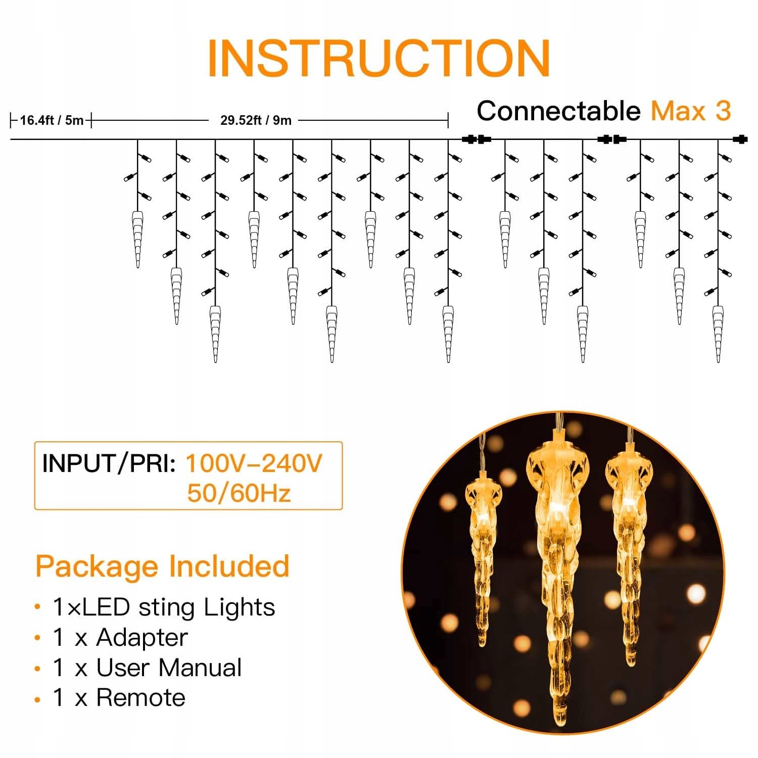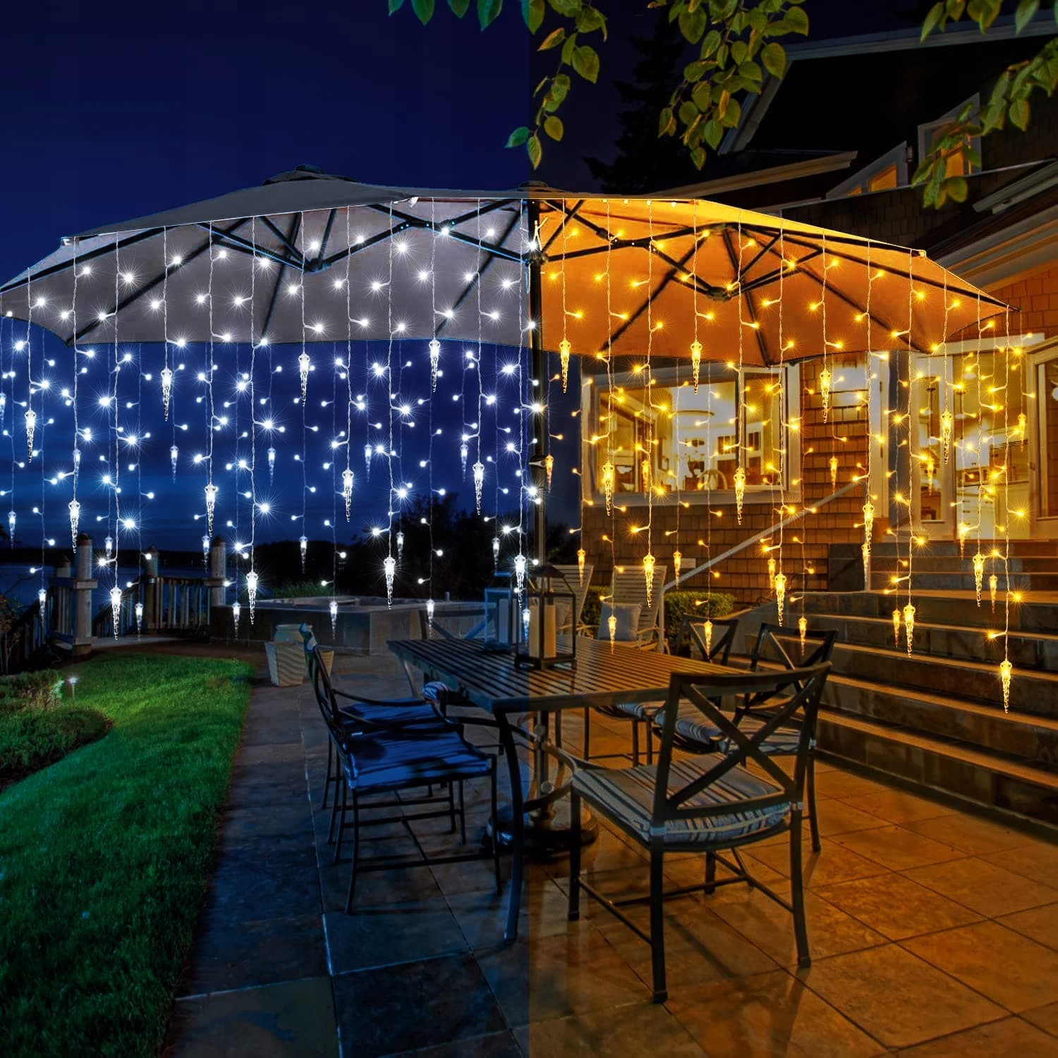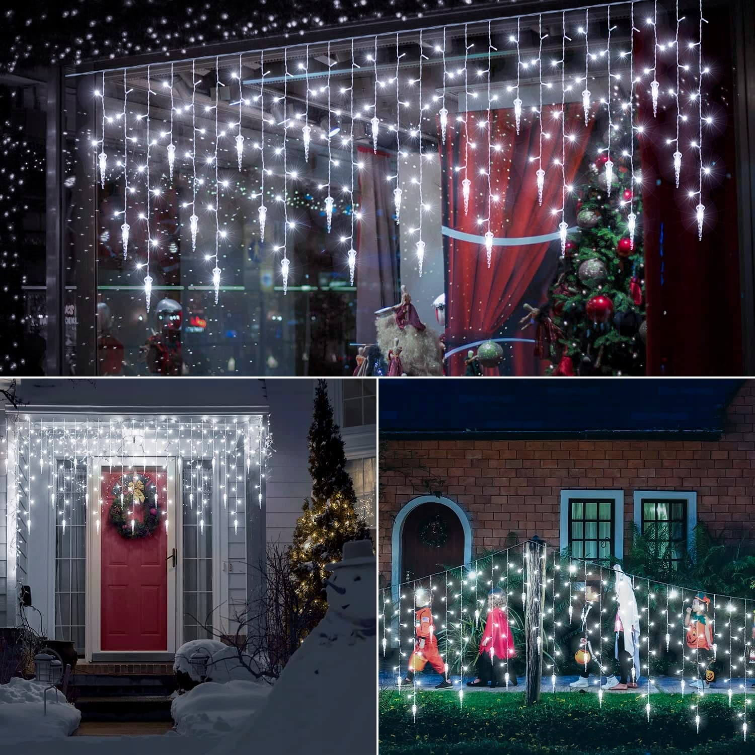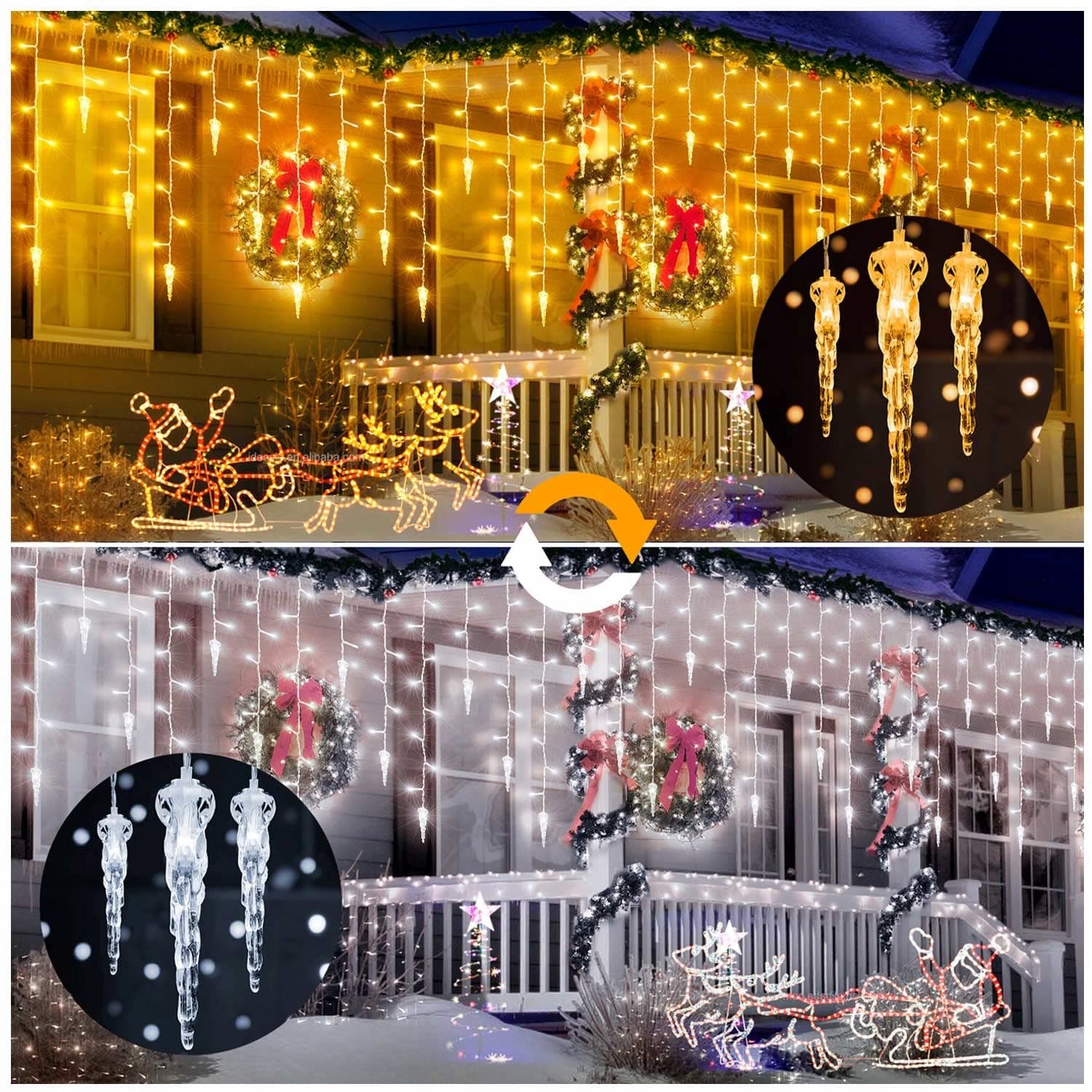 [WSZECHSTRONNE OŚWIETLENIE DEKORACYJNE] Dzięki różnorodnym efektom świetlnym te lampki świetnie nadają się do dekoracji okapów, poręczy, schodów, tarasów, drzwi, okien i drzew. Różnej długości paski świetlne i sopelki lodu na końcu jasno świecą w świecie śniegu i lodu, nadając ciepłą atmosferę świątecznej nocy.