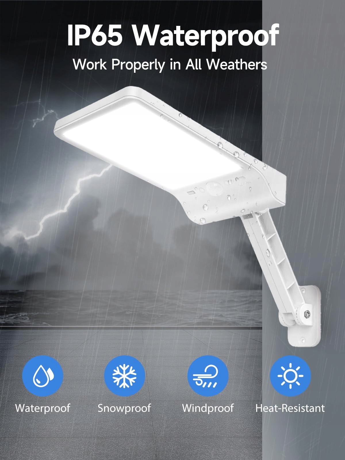 【Wodoodporność IP65】Lampa solarna na zewnątrz z czujnikiem ruchu wykonana jest z wysokiej jakości ABS, który jest wodoodporny i odporny na wysokie temperatury, wytrzymując różne trudne warunki pogodowe. Nadaje się do różnych miejsc, takich jak podwórka, werandy, gospodarstwa, tarasy, ogrody itp.