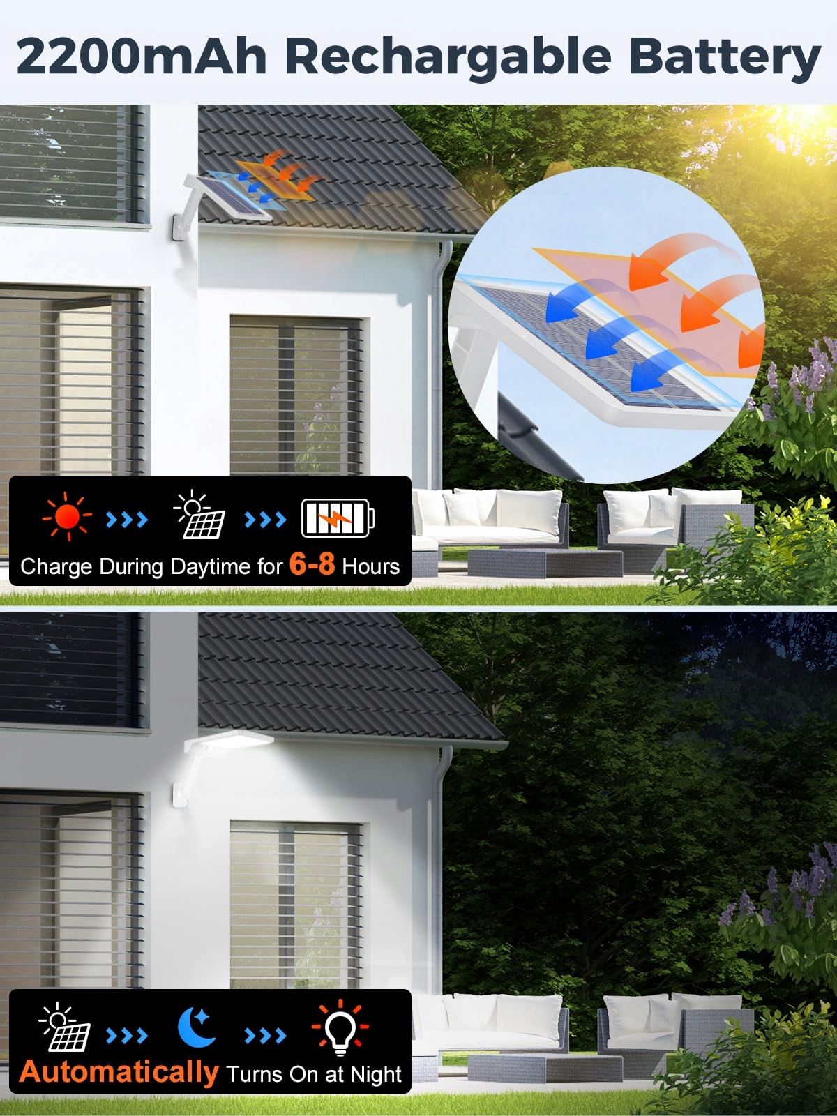 【Efektywna lampa solarna ścienna na zewnątrz】Brak kosztów energii! Panel solarny pochłania i przekształca światło słoneczne w energię elektryczną, która jest magazynowana w akumulatorze litowo-jonowym 2200 mAh. Po 6-8 godzinach ładowania w BEZPOŚREDNIM świetle słonecznym w ciągu dnia, lampa solarna automatycznie włącza się w nocy i zapewnia doskonałe oświetlenie dzięki 56 super jasnym diodom LED dla Twojej przestrzeni na zewnątrz