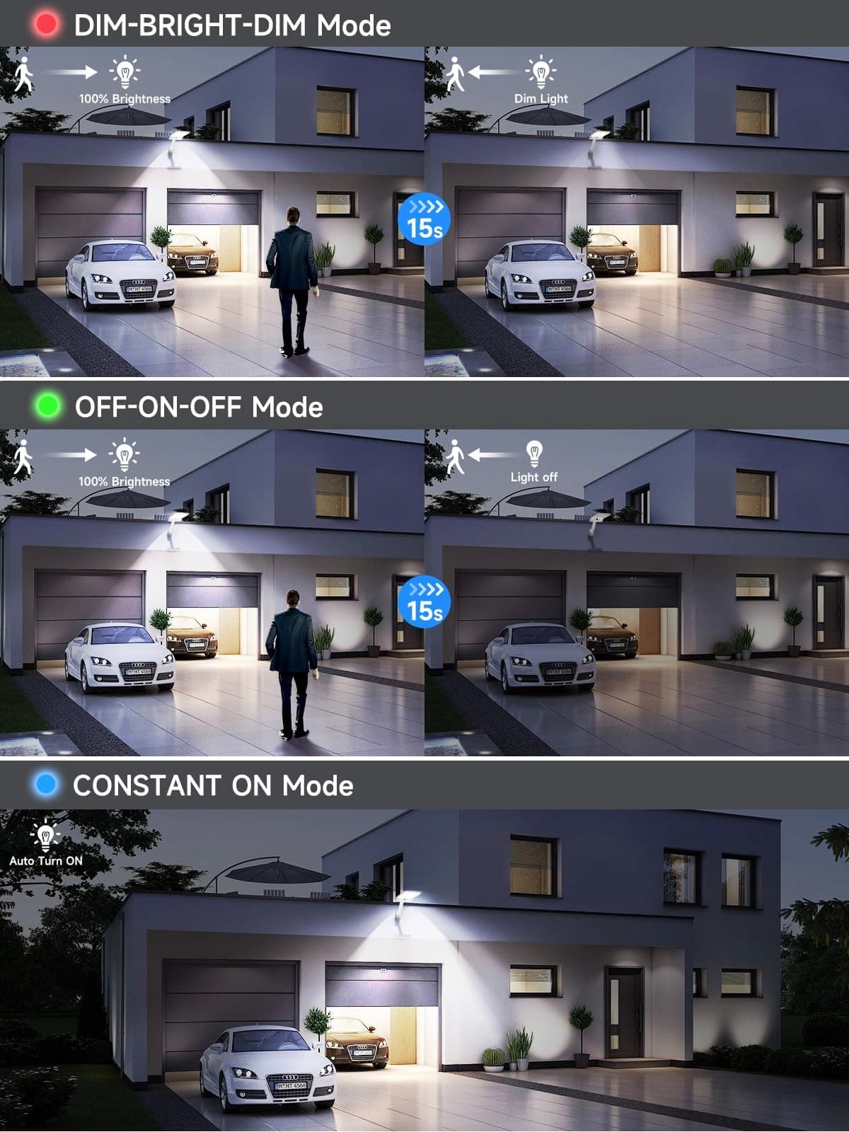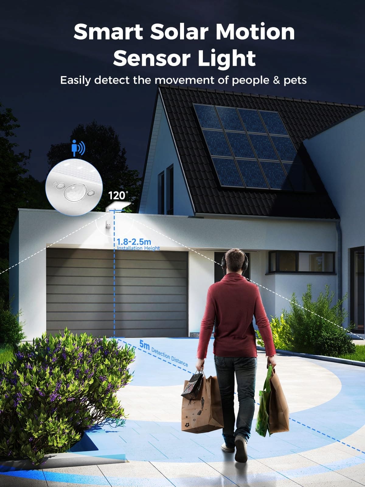 【3 tryby oświetlenia do wyboru】Oferuje 3 tryby oświetlenia: ①TRYB CZUJNIKA RUCHU + PRZYCIEMNIONE ŚWIATŁO: Lampa w nocy włącza się na 100% jasności po wykryciu ruchu, po 15 sekundach światło jest przyciemniane ②TRYB CZUJNIKA RUCHU: Lampa w nocy włącza się na 100% jasności po wykryciu ruchu, po 15 sekundach wyłącza się ③TRYB STAŁEGO ŚWIATŁA: Lampa automatycznie włącza się w nocy. Czujnik ruchu lampy solarnej LED wykrywa ruch w zakresie od 1 do 5 metrów