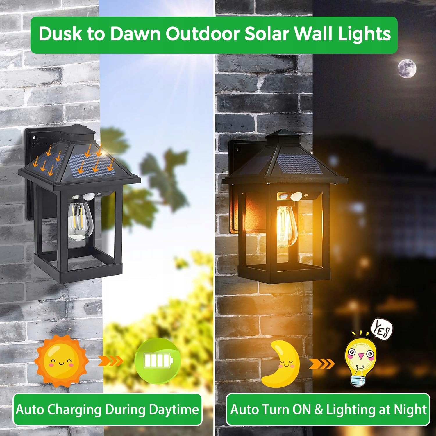 【Energooszczędna lampa ścienna solarna na zewnątrz】 Brak rachunków za prąd! Dekoracyjne lampy ścienne z 3-stronnym panelem solarnym mogą pochłaniać więcej energii słonecznej i przekształcać światło słoneczne w elektryczność, a następnie przechowywać ją w akumulatorze litowo-jonowym 2200 mAh. Wydajność ładowania jest o 26% wyższa niż w podobnych produktach. Po pełnym naładowaniu przez 6-8 godzin w bezpośrednim świetle słonecznym w ciągu dnia lampy ścienne solarne działają bardzo efektywnie w nocy