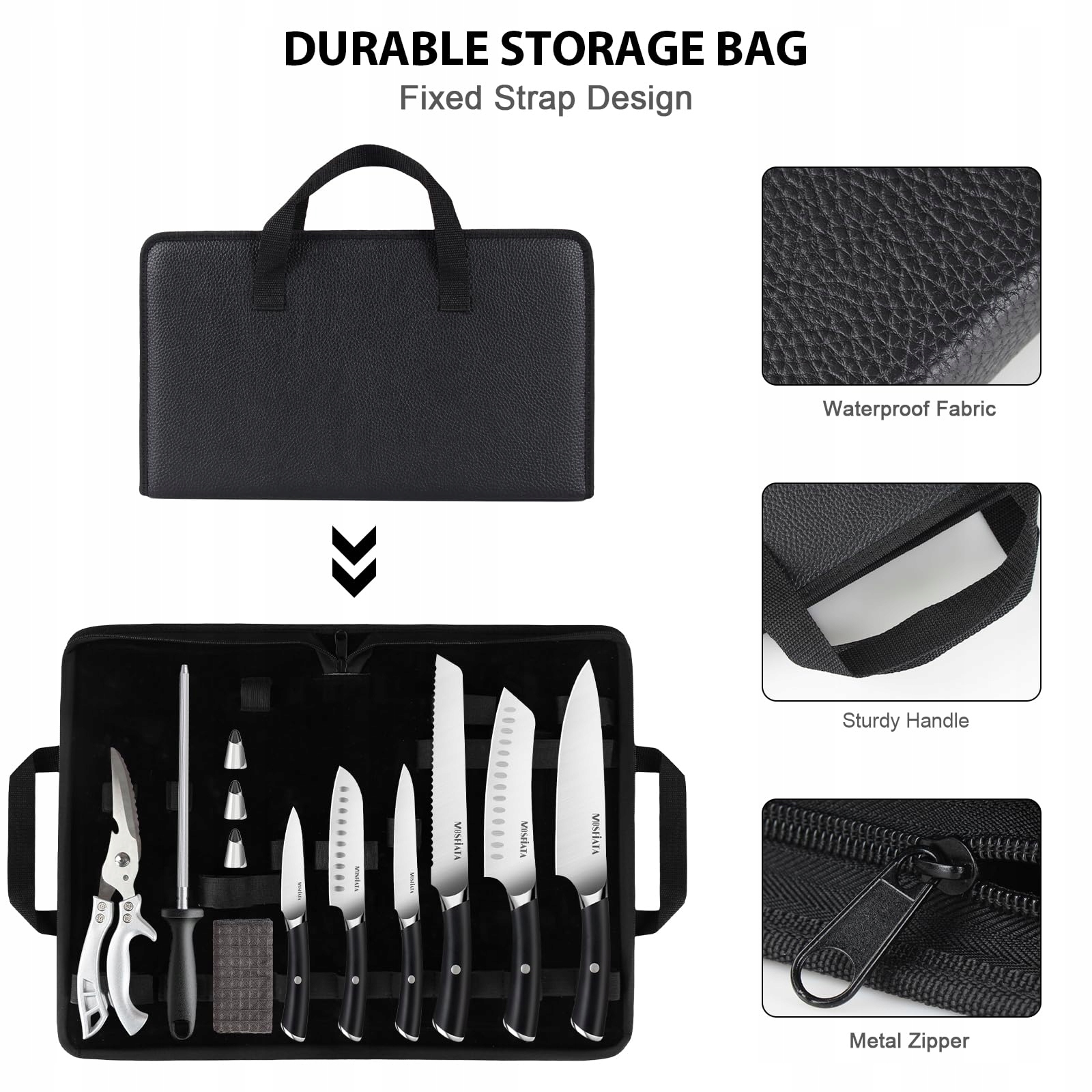 Przenośna torba do przechowywania na zewnątrz i w podróży – zestaw noży kuchennych dostarczany jest z trwałą, wielowarstwową torbą skórzaną, wyposażoną w paski mocujące. Dzięki całkowicie otwartej konstrukcji noże są szybko dostępne – idealne do biwakowania, grillowania, wędrówek lub użycia w kuchni na świeżym powietrzu