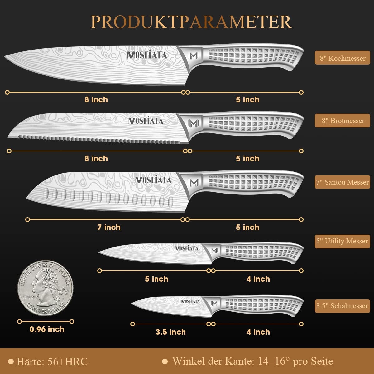 Zestaw noży kuchennych MOSFiATA ze stali nierdzewnej, 5 sztuk zestawów noży kuchennych, nóż szefa kuchni, nóż Santoku, nóż uniwersalny, nóż do chleba, nóż do obierania, z osłoną na palce i pudełkiem prezentowym