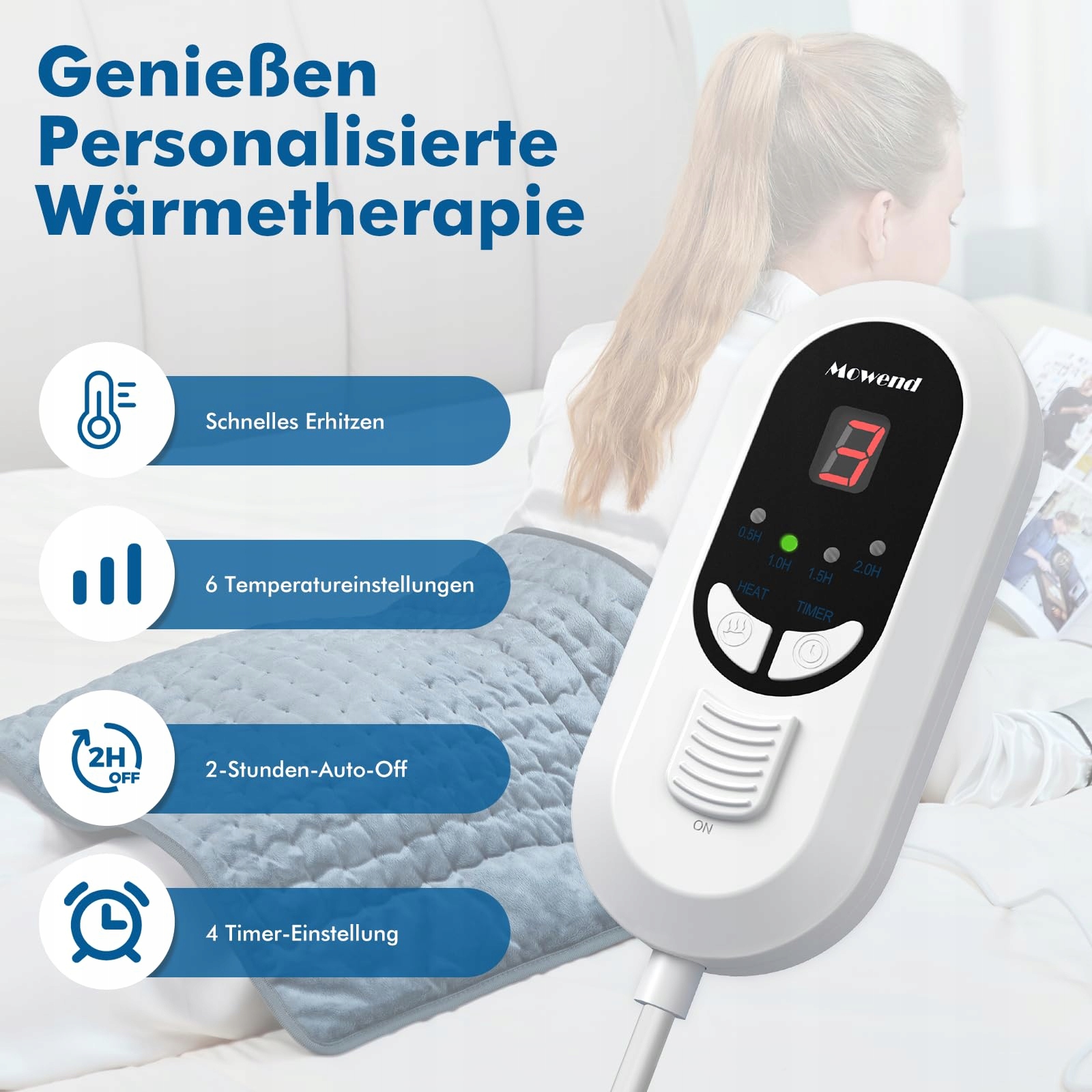 Mowend Poduszka grzewcza, 50x60cm Elektryczna poduszka grzewcza z 6 ustawieniami grzania i automatycznym wyłączaniem, szybkie nagrzewanie i możliwość prania w pralce, łagodzenie bólu, prezenty dla żony, mamy, taty, babci