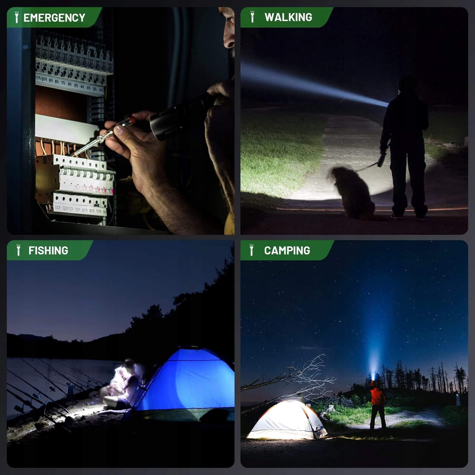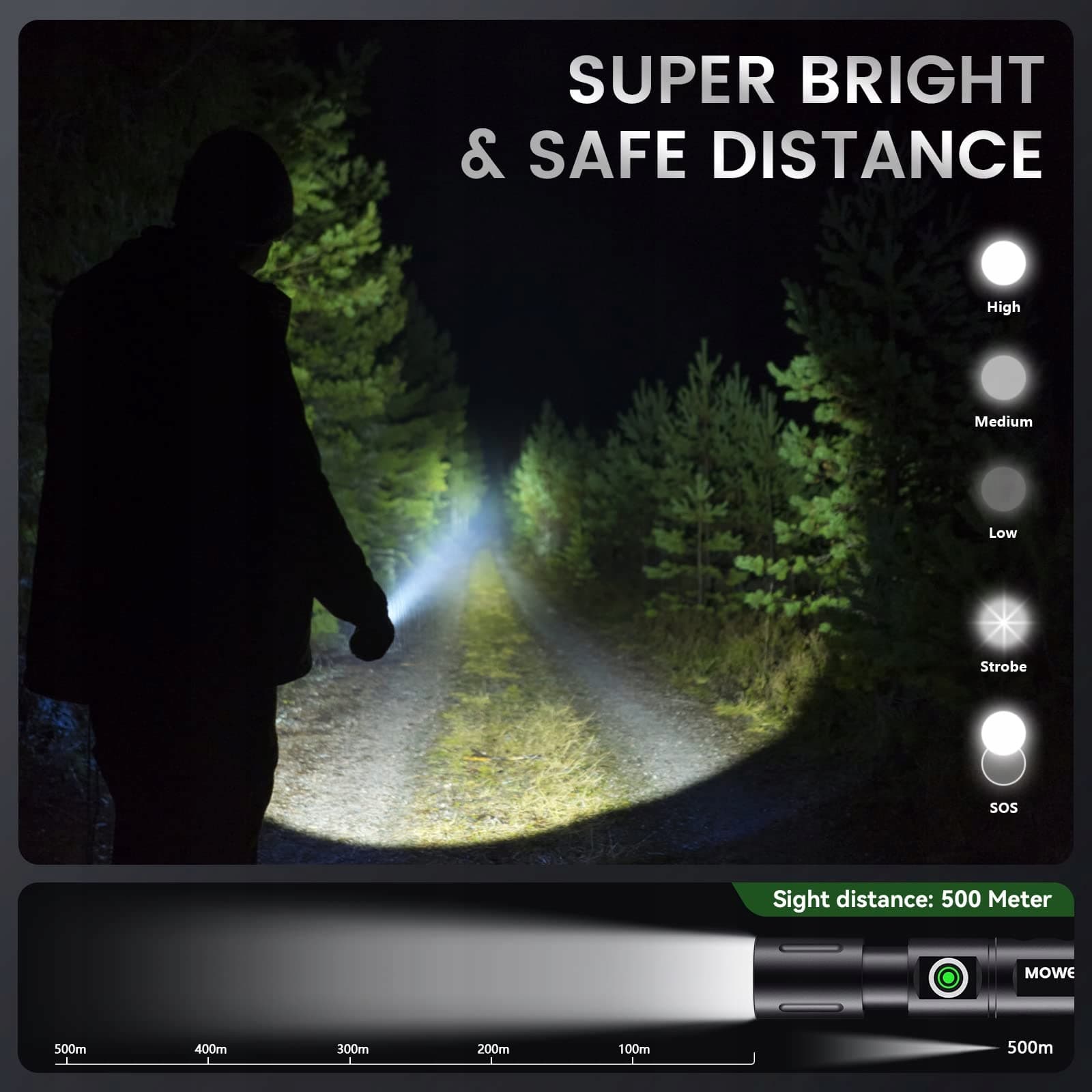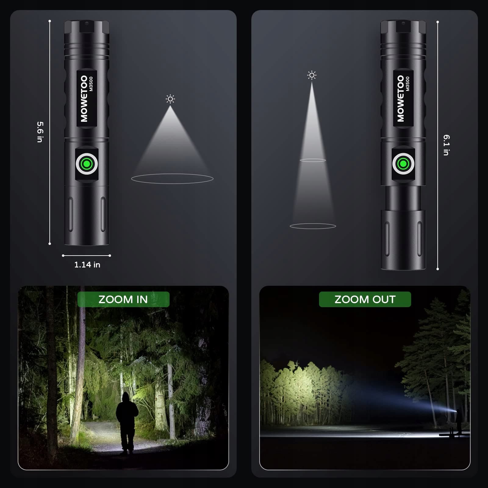 5 trybów oświetlenia i zoom: Jedno-przyciskowa kontrola 5 trybów oświetlenia: Wysoka jasność, średnia jasność, niska jasność, tryb migania, tryb awaryjny. Latarki z zoomowalnym designem latarki mogą dostosować ogniskową w zależności od potrzeb, dzięki czemu możesz swobodnie wybierać między reflektorem a latarką szerokokątną, aby w pełni zaspokoić wymagania oświetleniowe różnych okazji