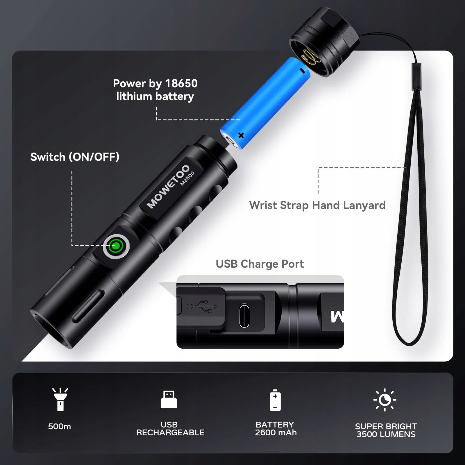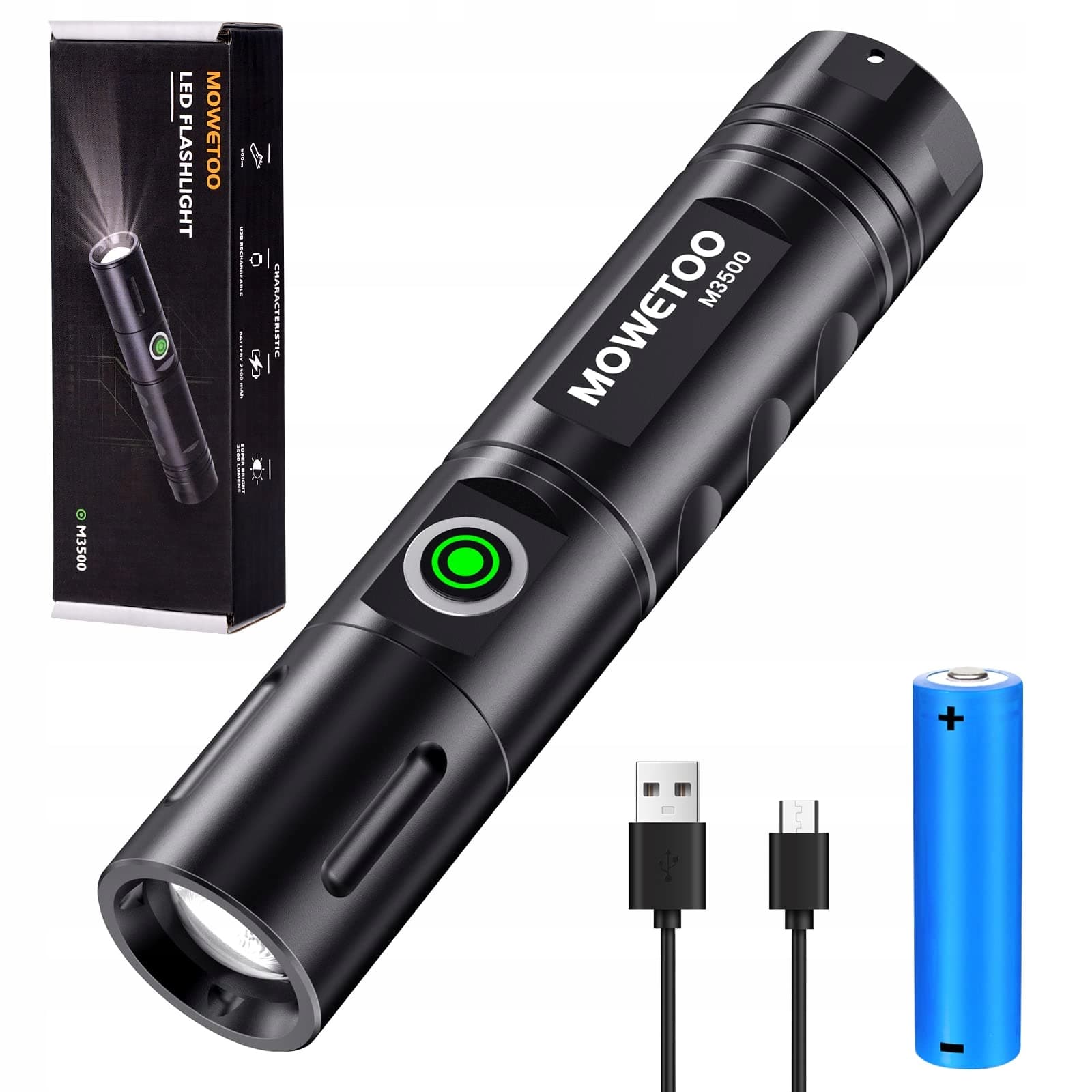 MOWETOO Latarka LED 3500 Lumenów Zoom Akumulatorowa 3 Tryby