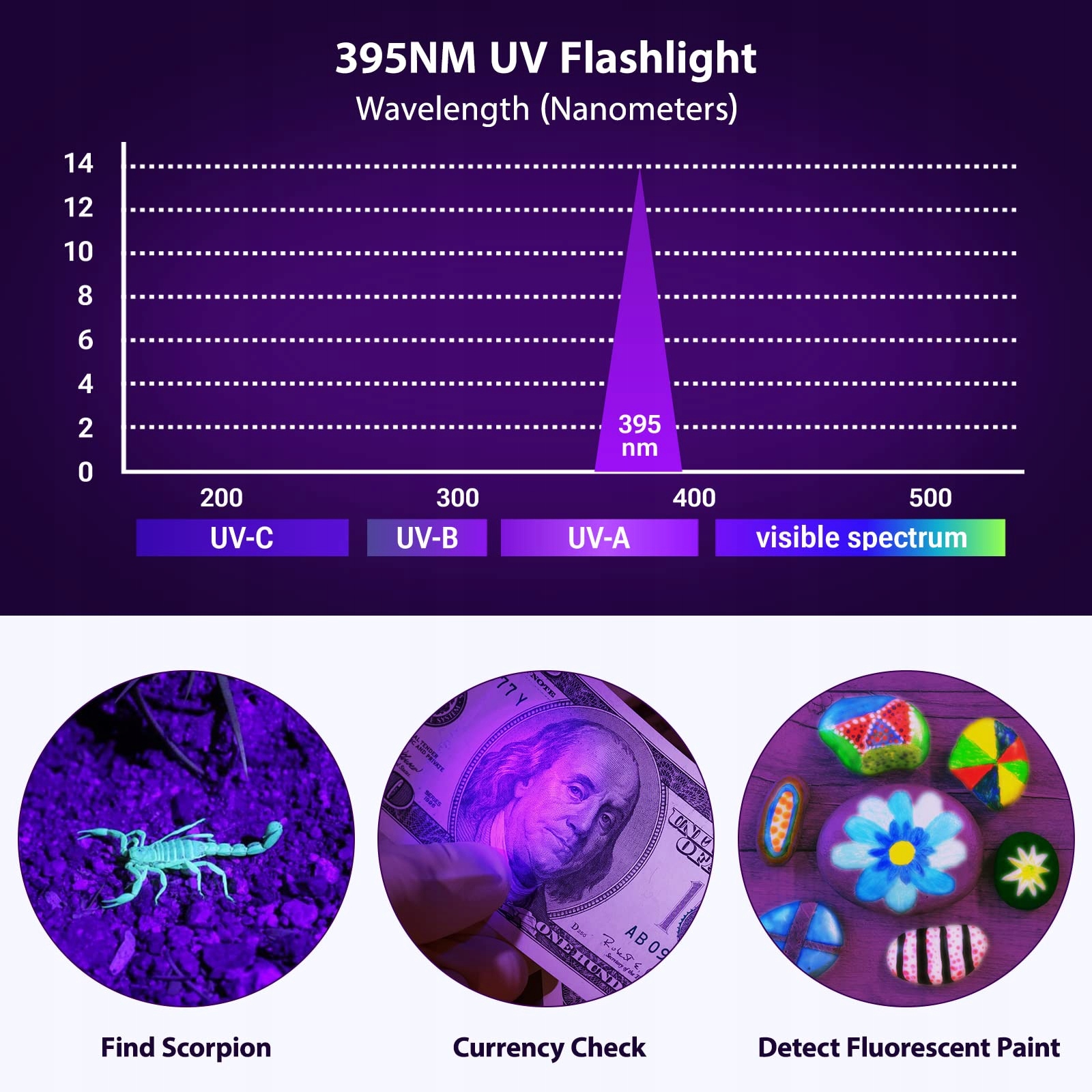 395NM latarka UV: latarki UV pozwalają łatwo znaleźć plamy na zwierzętach domowych. Może wykrywać grzyby w jedzeniu i sprawdzać, czy banknoty są fałszywe, co może być pomocne przy ocenie antyków
