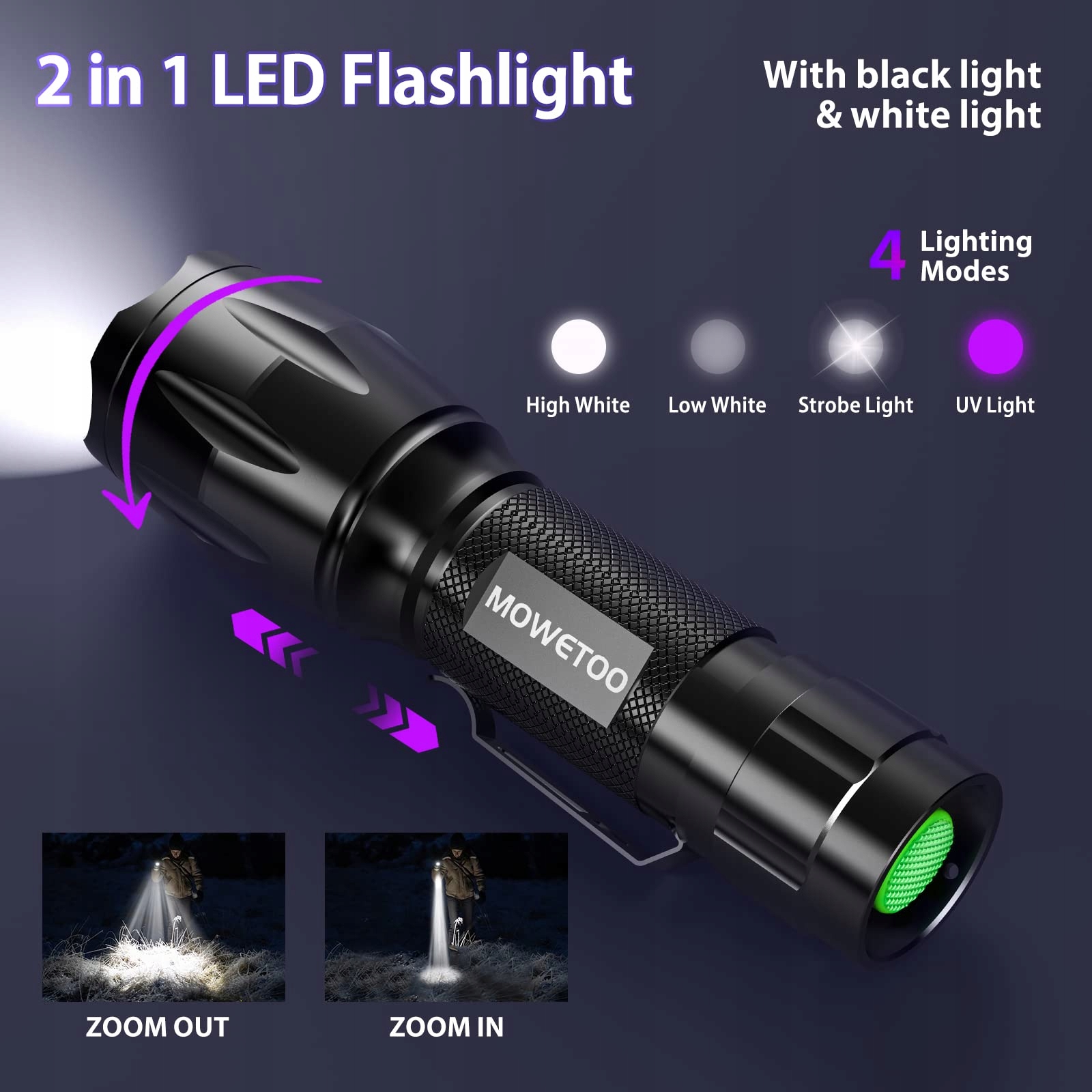 Lampa MOWETOO, lampa UV 2 w 1 LampaLicht Led latarka, 395nm ultrafioletowa latarka 4 tryby, detektor fałszywych banknotów, moczu psów i innych zwierząt domowych 40W