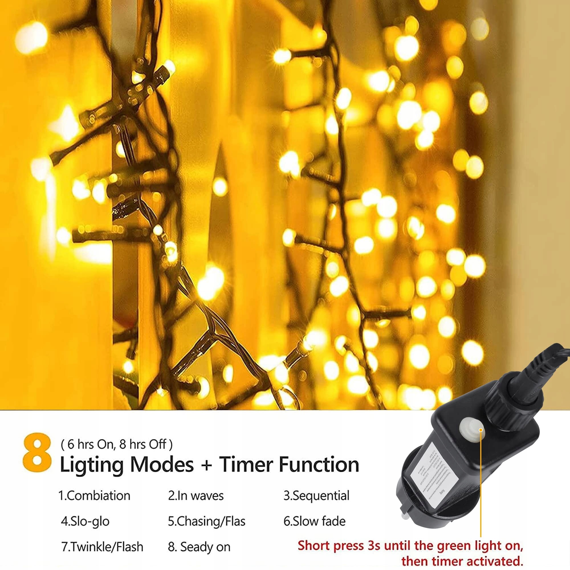 🎄 8 Trybów Oświetlenia - Lichterkette weihnachten ma 8 trybów oświetlenia do wyboru: kombinacja, fala, sekwencja, slogs, bieganie/miganie, wolne wygaszanie, miganie/miganie i światło stałe.